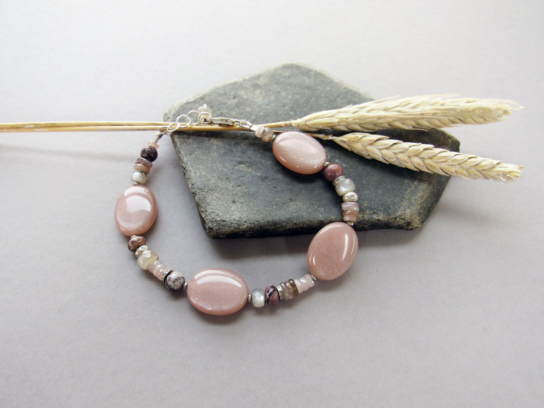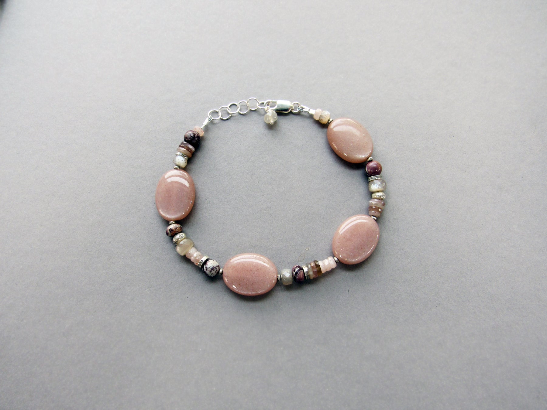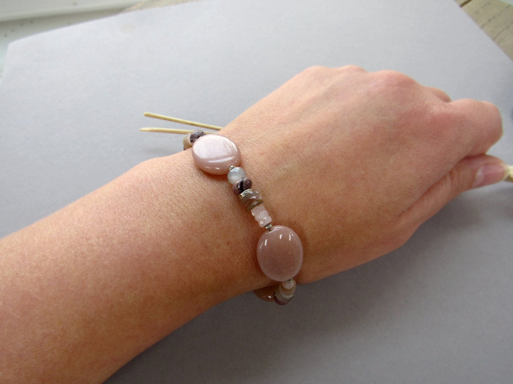 This bracelet is a cozy combination of beautiful gems in shades of soft peach/pink, mauve, brown, and gray.