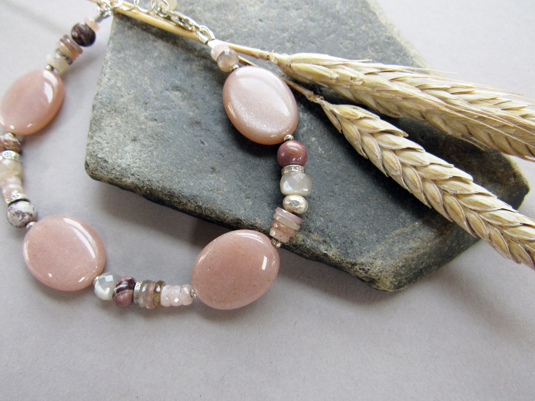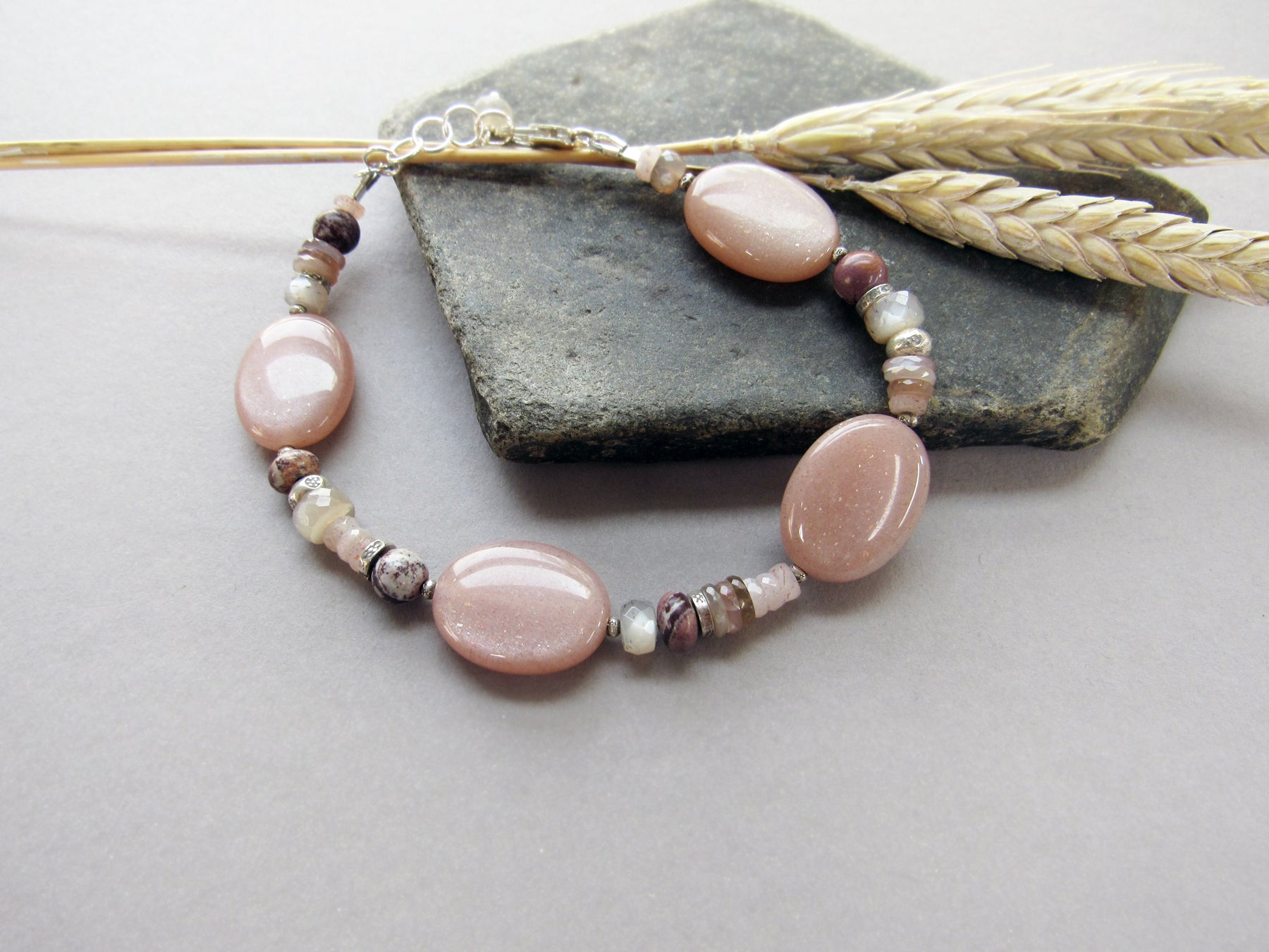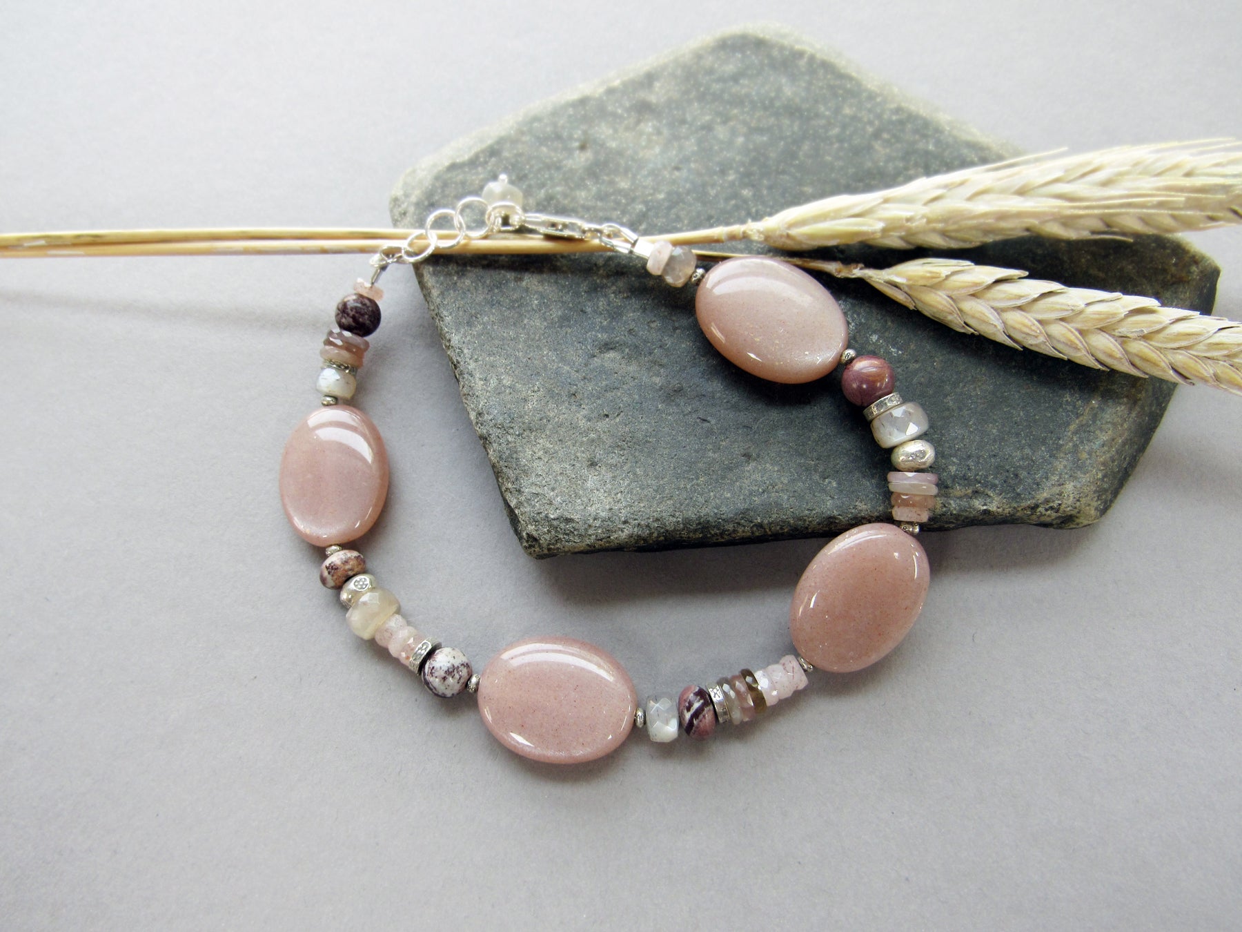 This bracelet is a cozy combination of beautiful gems in shades of soft peach/pink, mauve, brown, and gray.
