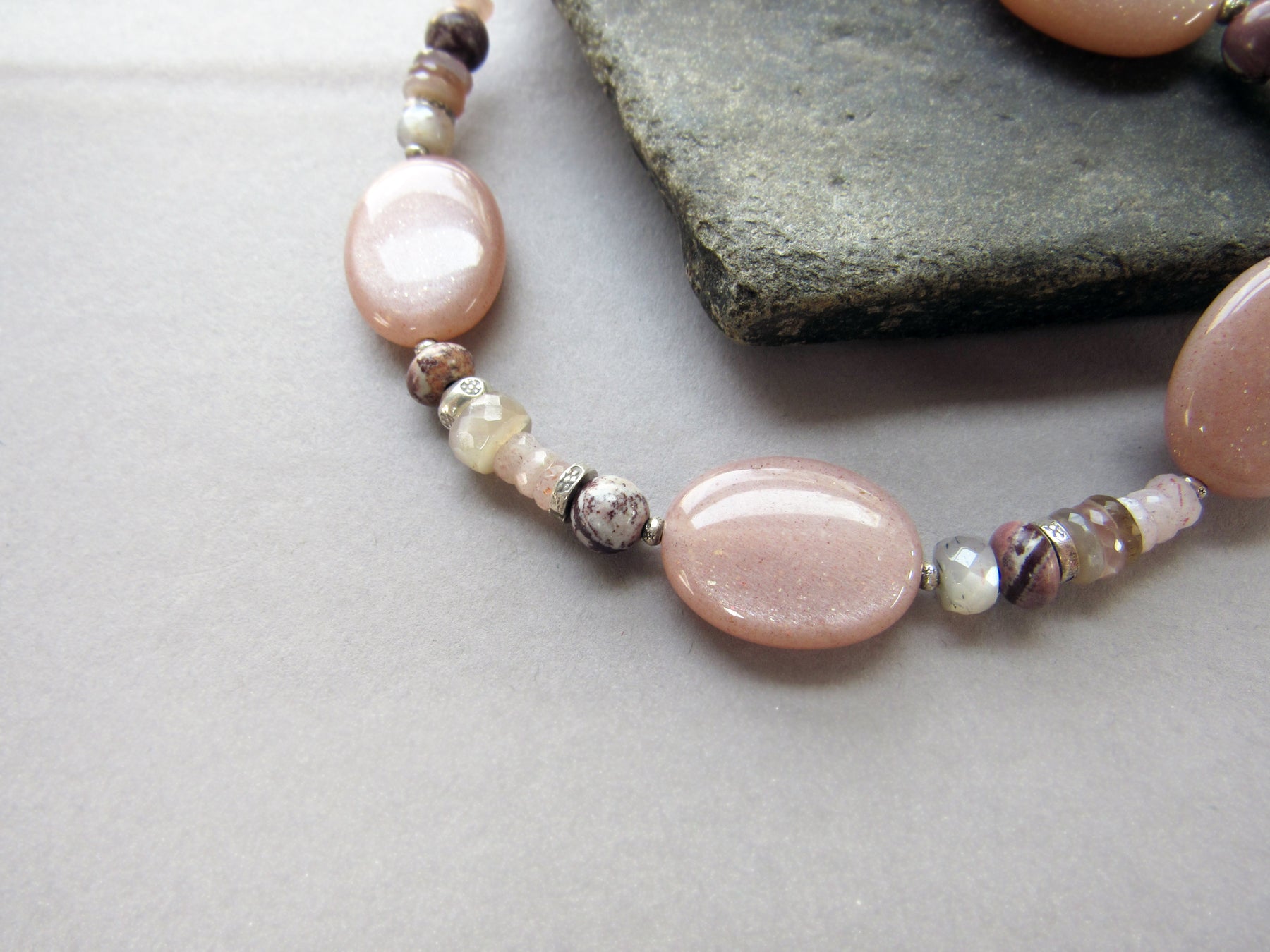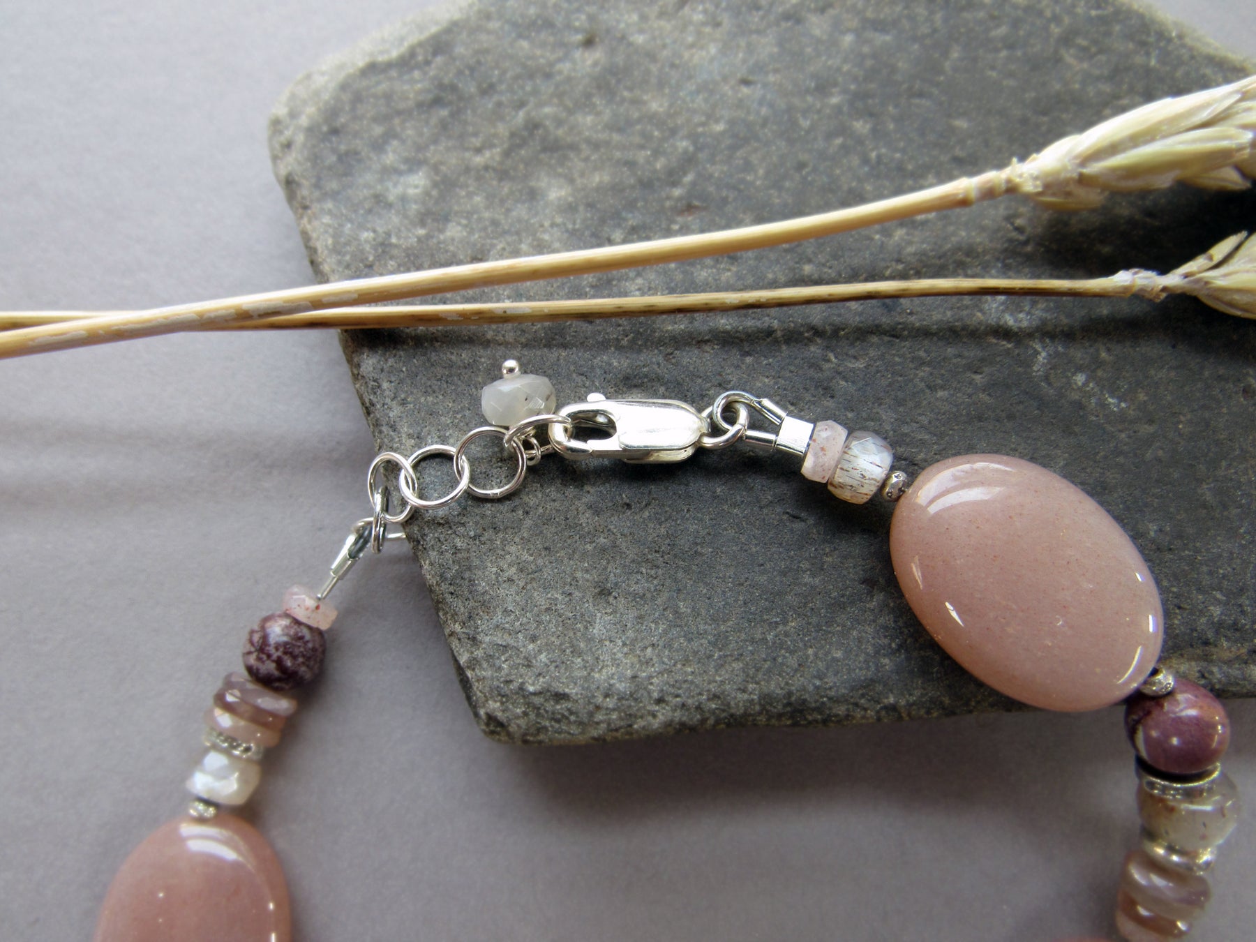The gemstones are peach moonstone, chocolate moonstone, and dendritic rhyolite jasper. The moonstones have a lovely glow and shimmer when the light hits them!