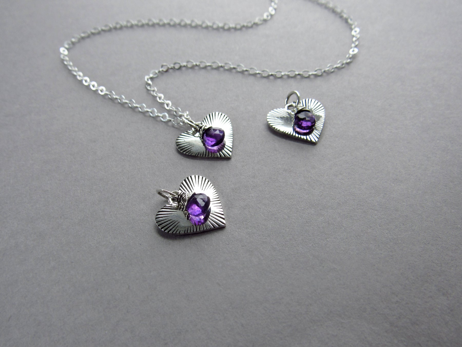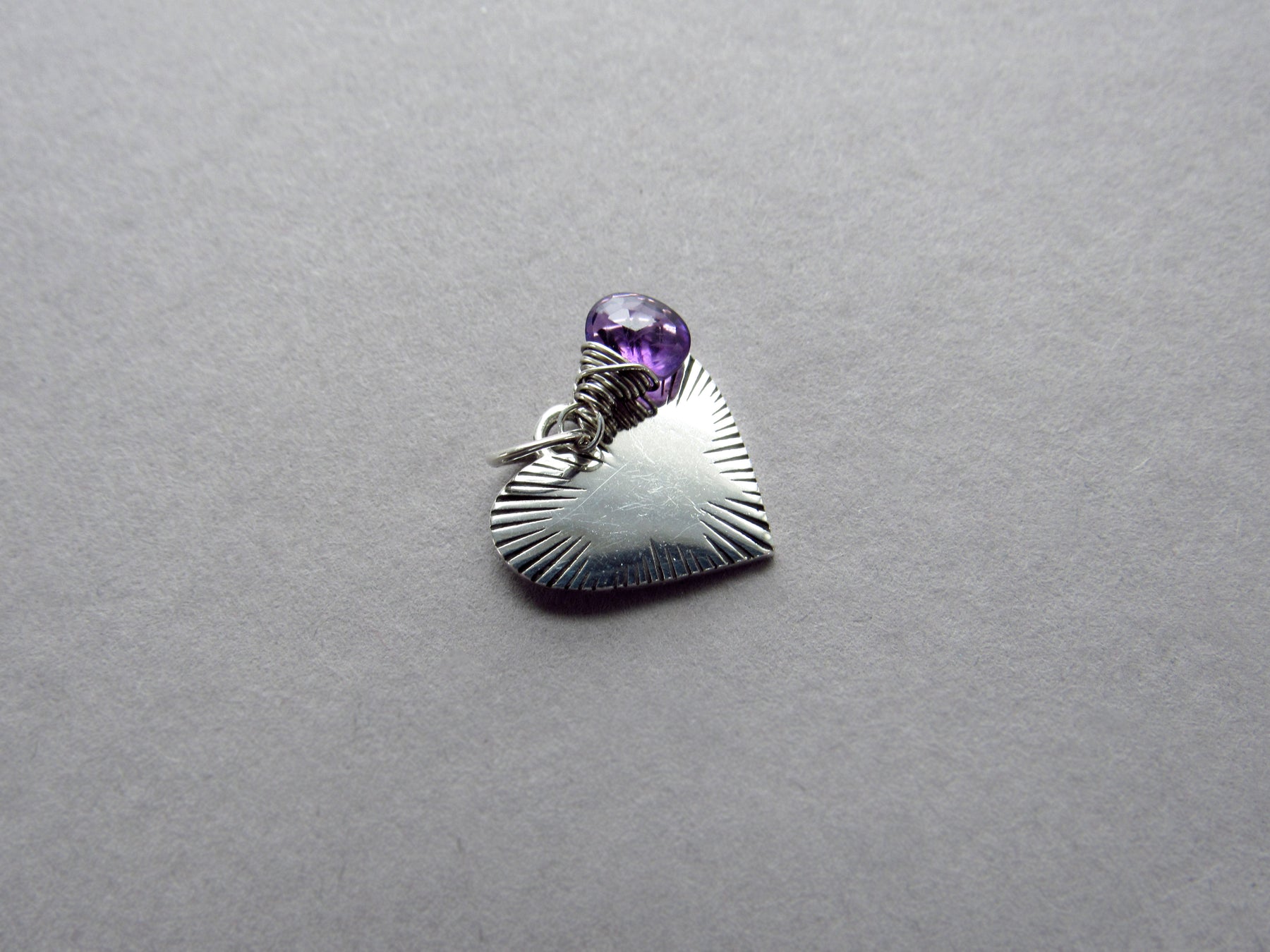 The heart has a beautiful shine with a burst of etched line details. I have accented it with a tiny amethyst tear drop. The charm has a closed jump ring. Wear it on its own or slide it along with other charms from your collection!