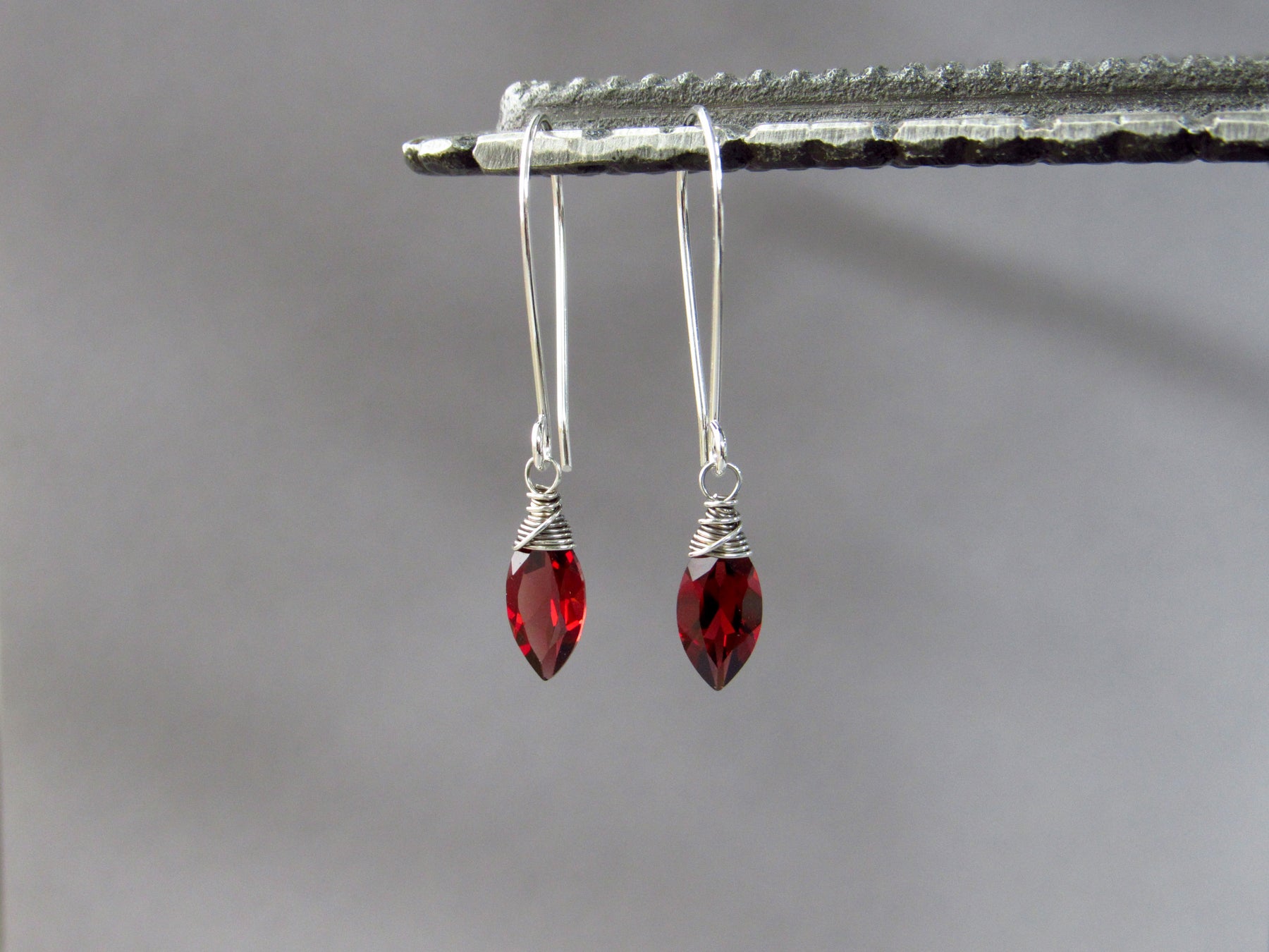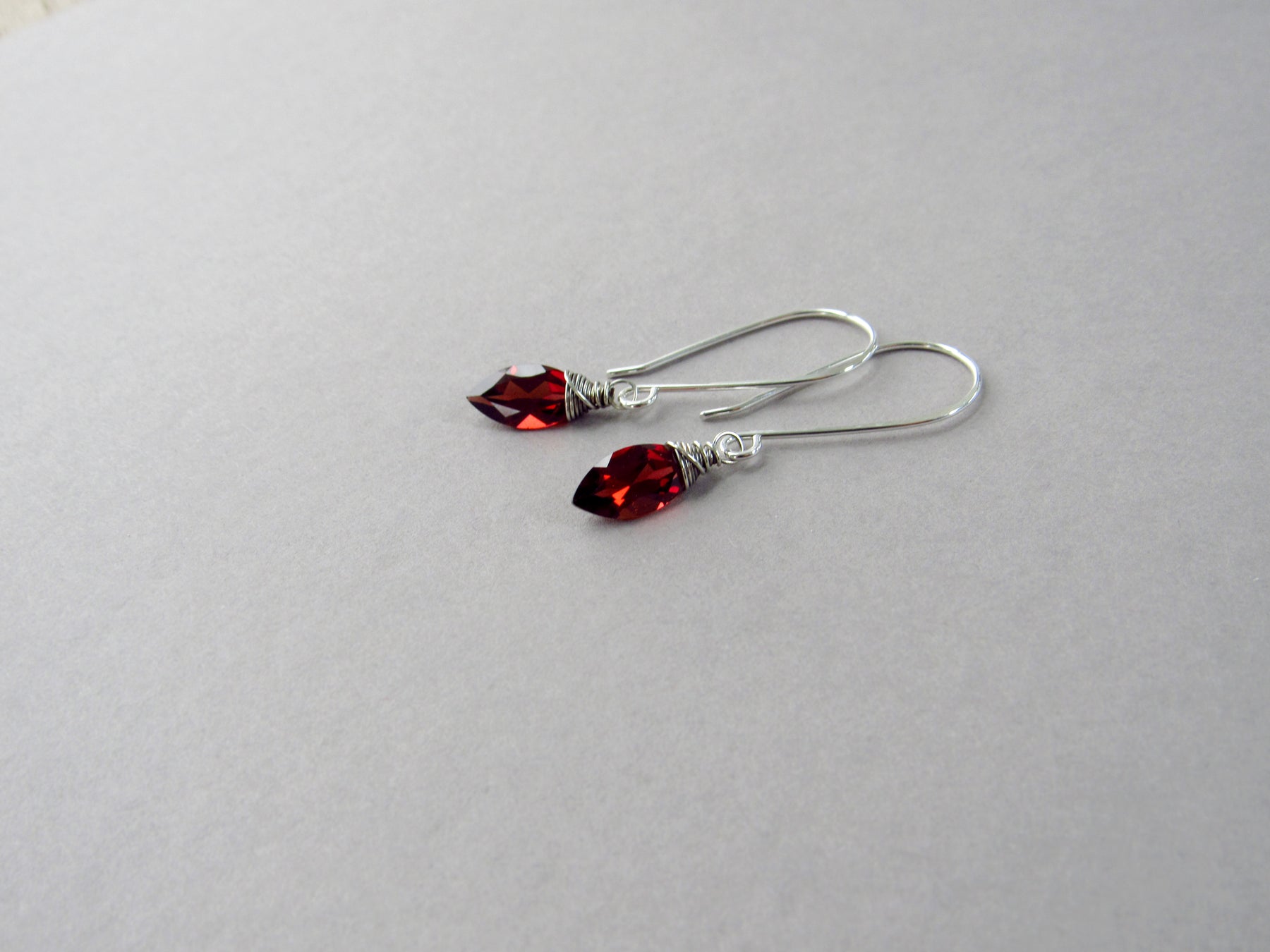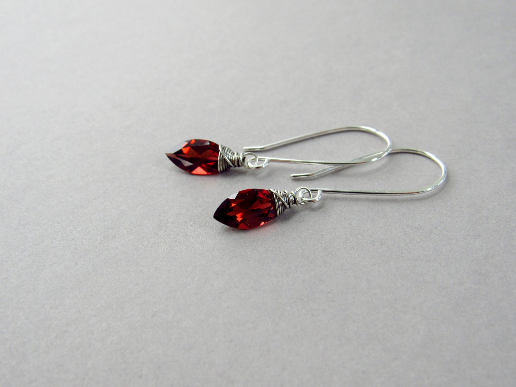 Elegant drop earrings featuring gorgeous, marquise cut garnet.
