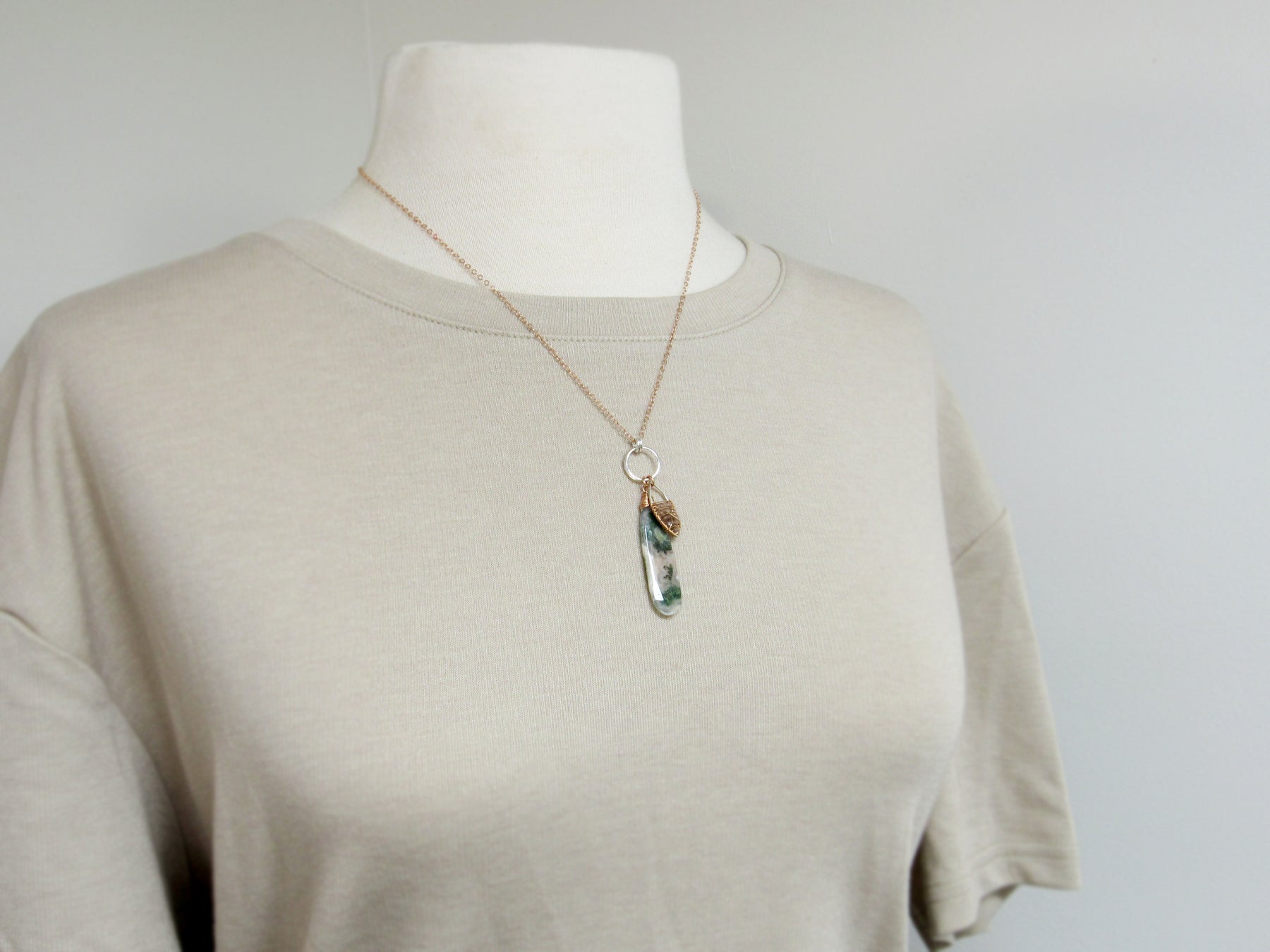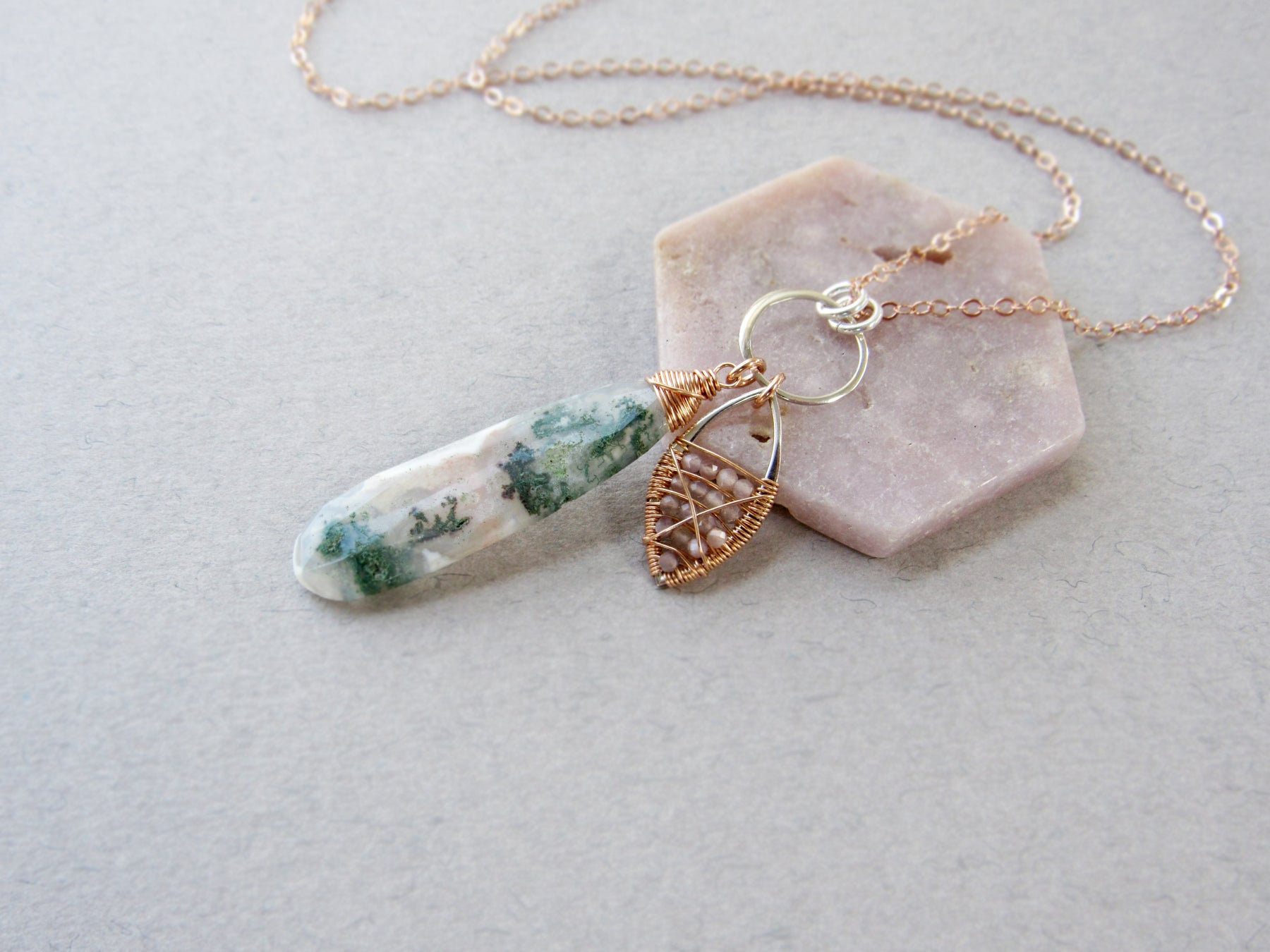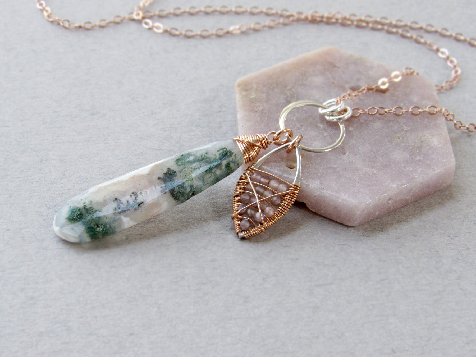 Materials:  14k rose gold fill, sterling silver, solar quartz, and peach moonstone.