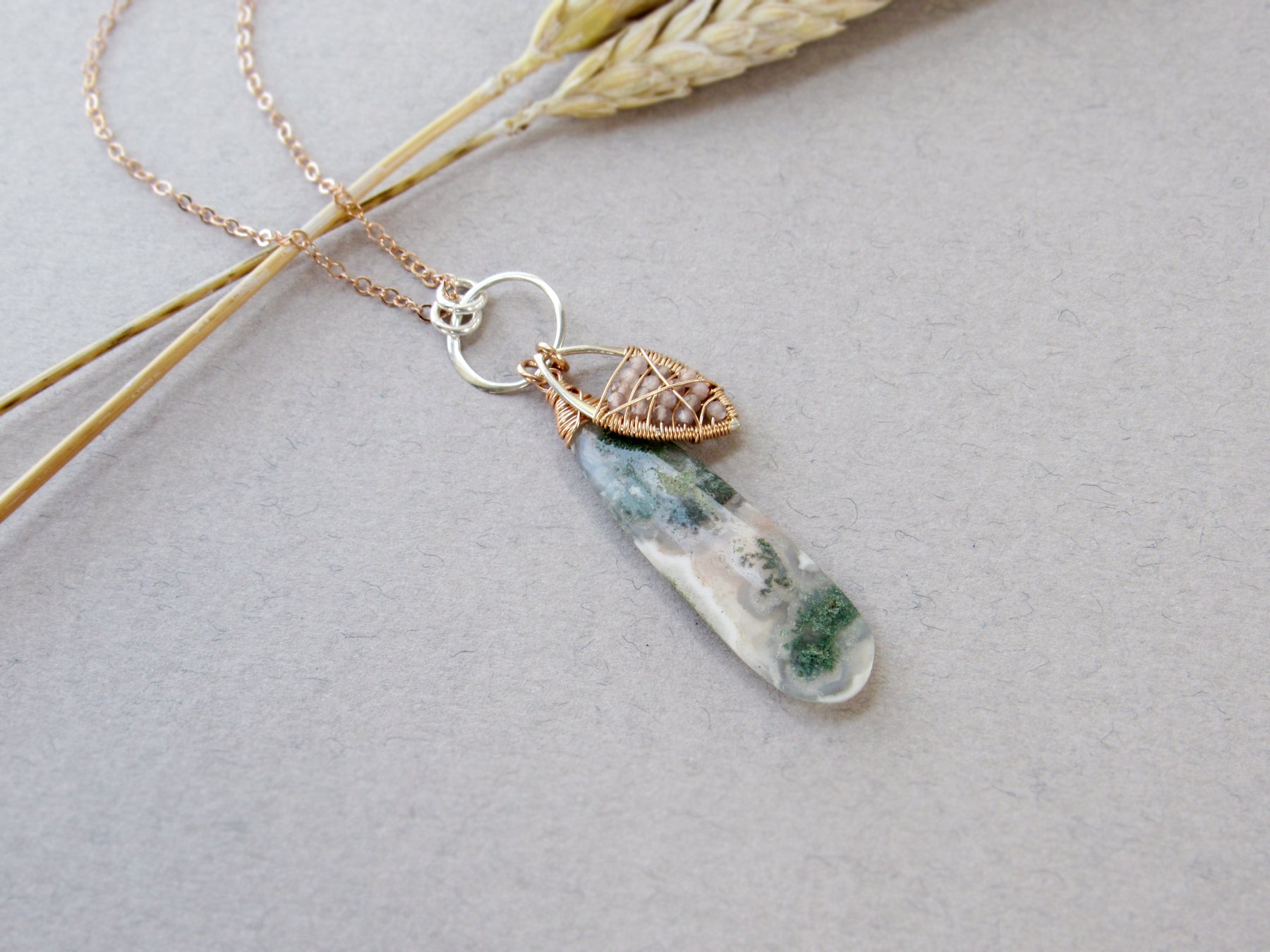 The solar quartz is accented with a silver leaf that I have intricately wire wrapped with tiny rows of peach moonstone.