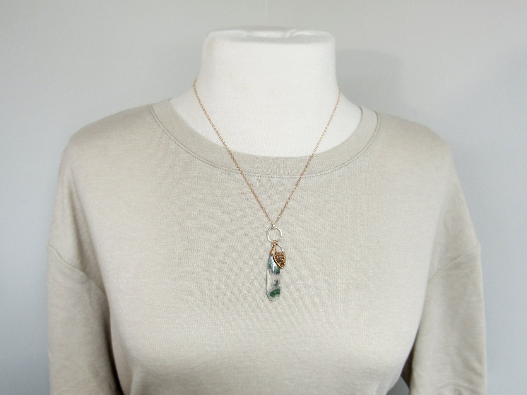 The focal drop stone is solar quartz which is somewhat translucent with swirling patterns in creamy white, soft peach, and mossy green.  (Please note that this stone has some natural and minor surface pitting, adding to its uniqueness).