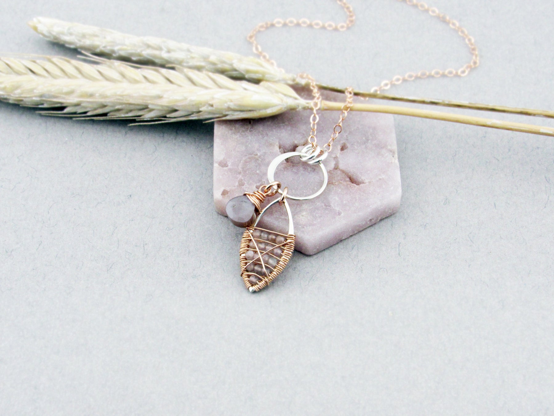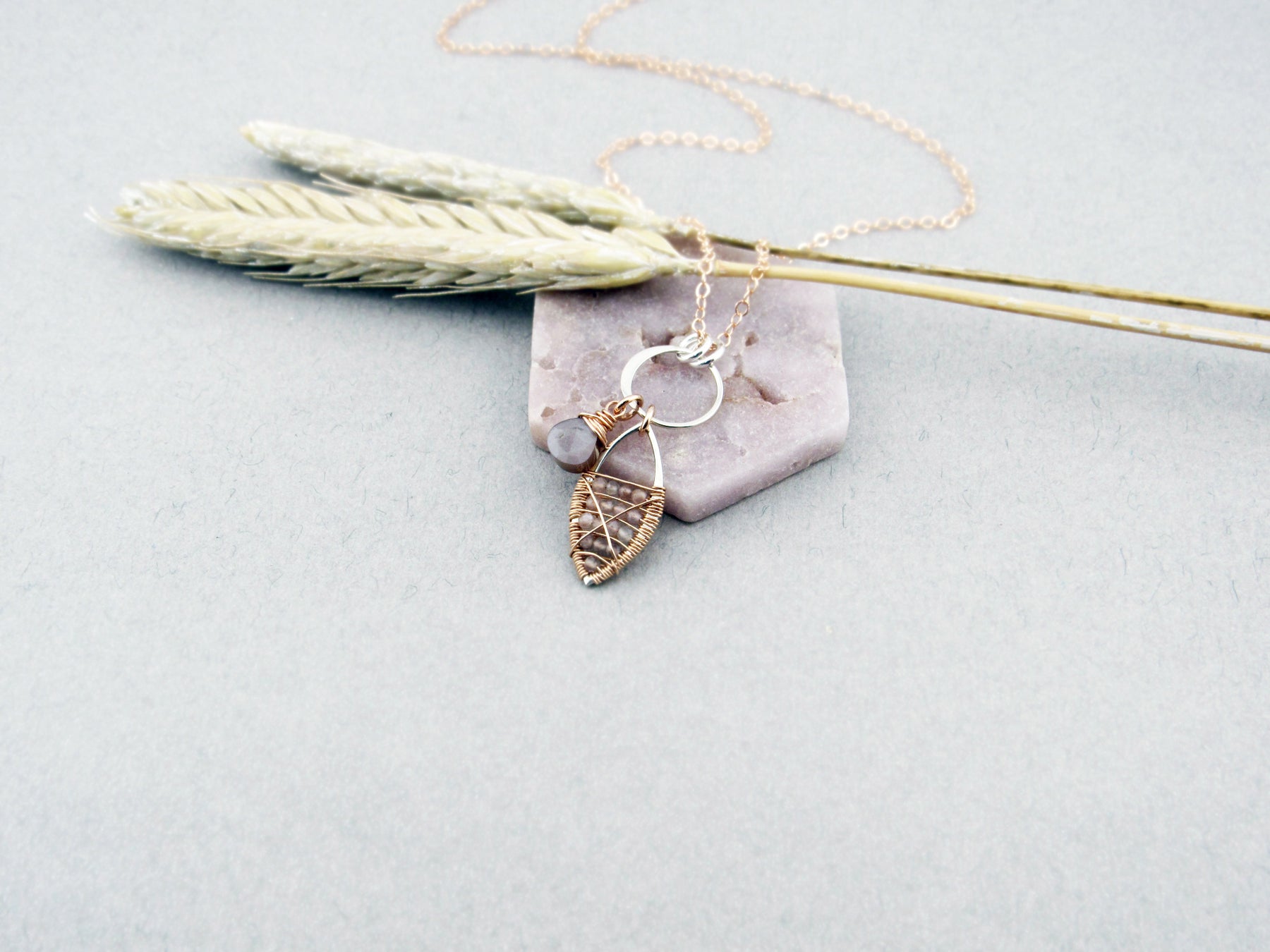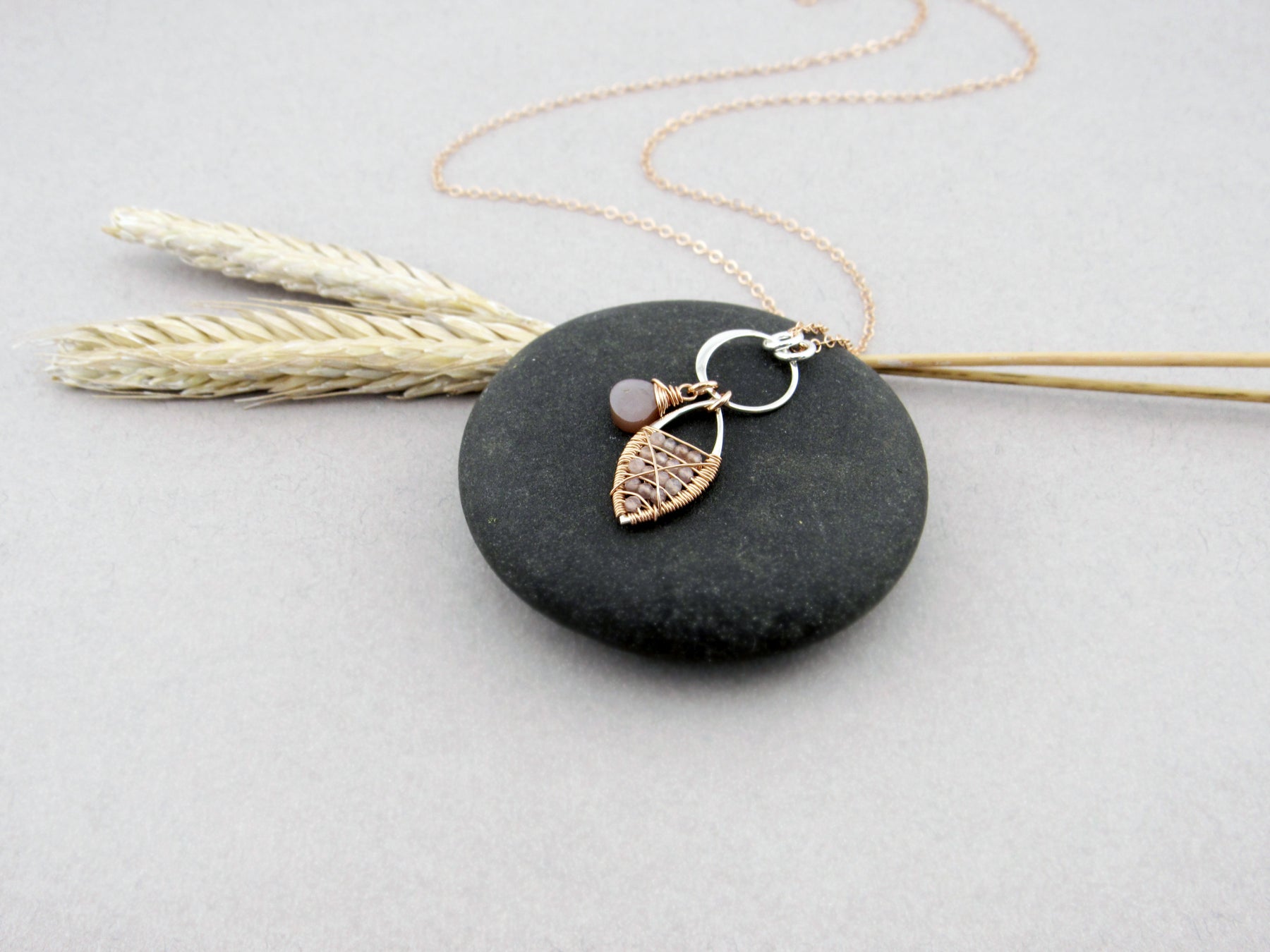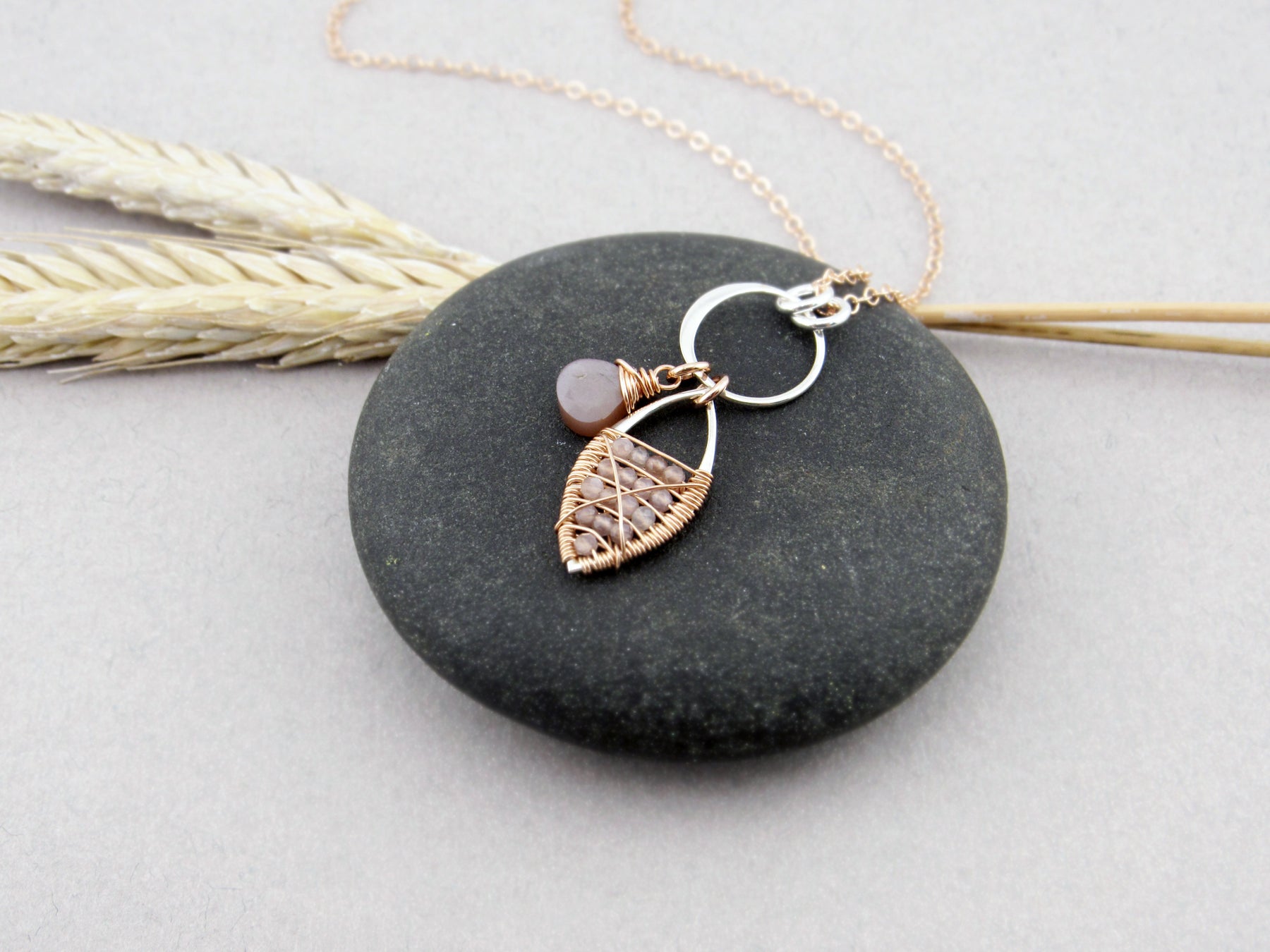 Materials: 14k rose gold fill, sterling silver, and peach moonstone.