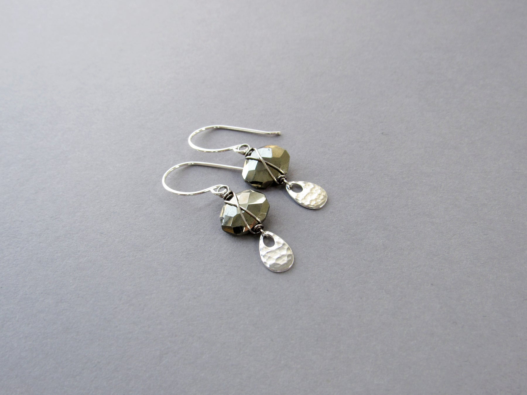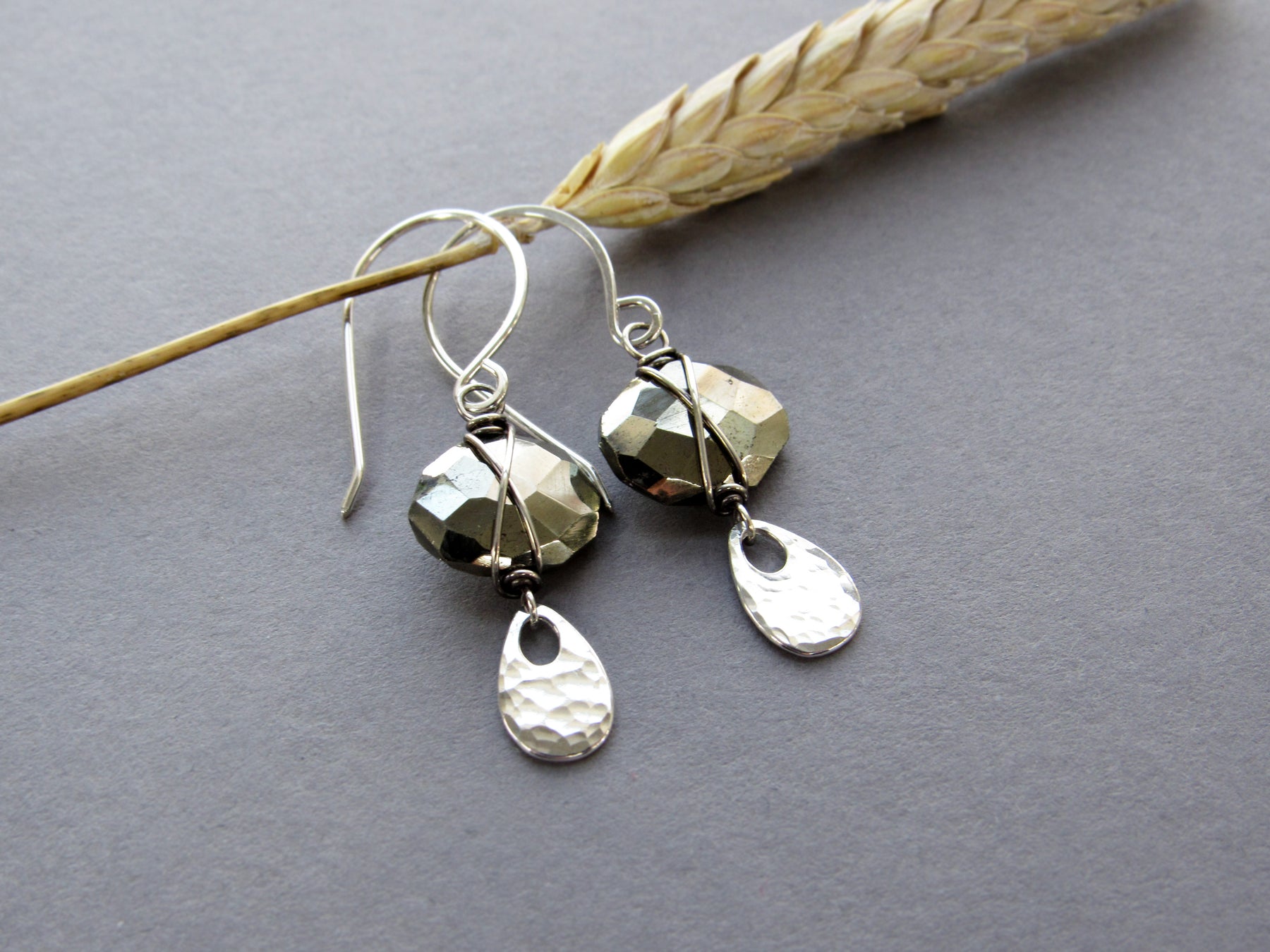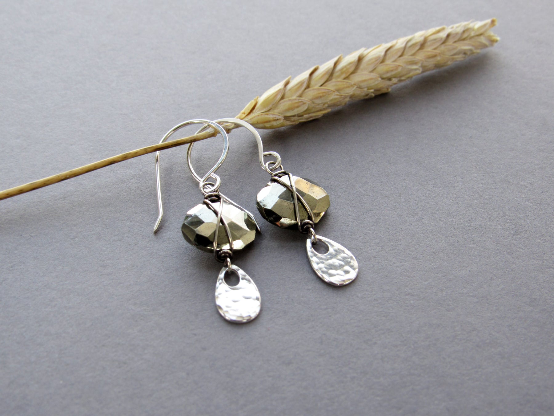 The pyrite stones are faceted for extra sparkle and they are securely wire wrapped in my signature crisscross style.  The silver charms are hand hammered for texture which gives them a lovely reflective quality.  *Please allow for slight variations in size and color of the gemstones due to their natural qualities.