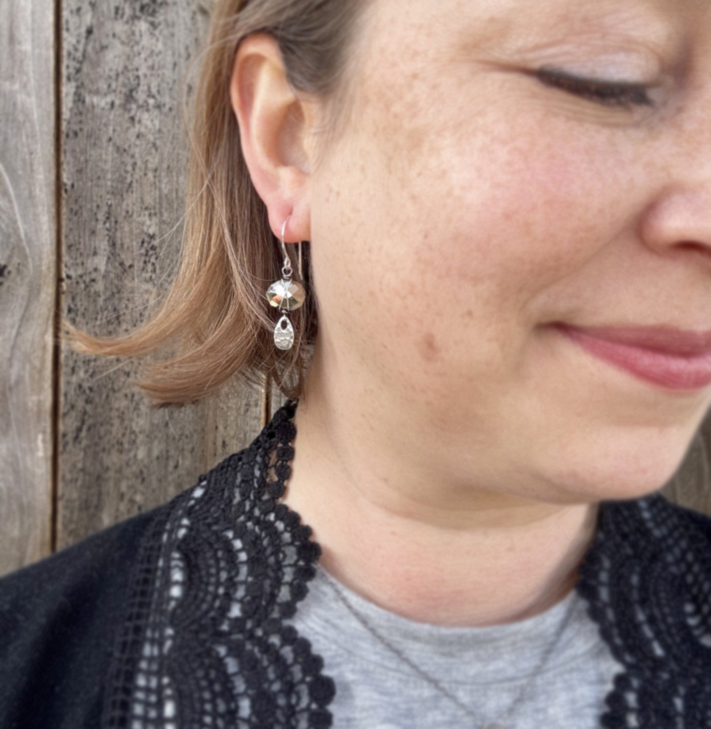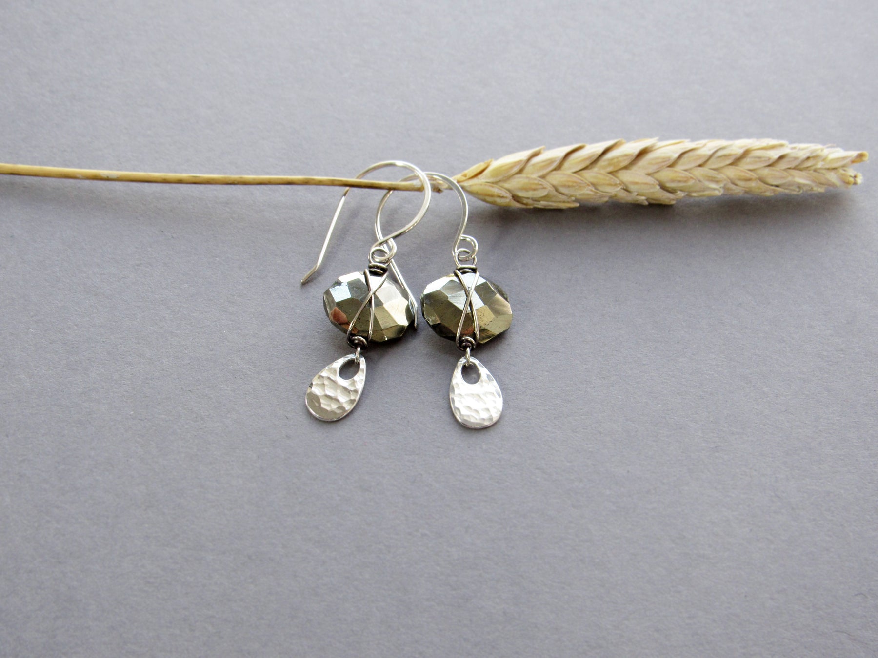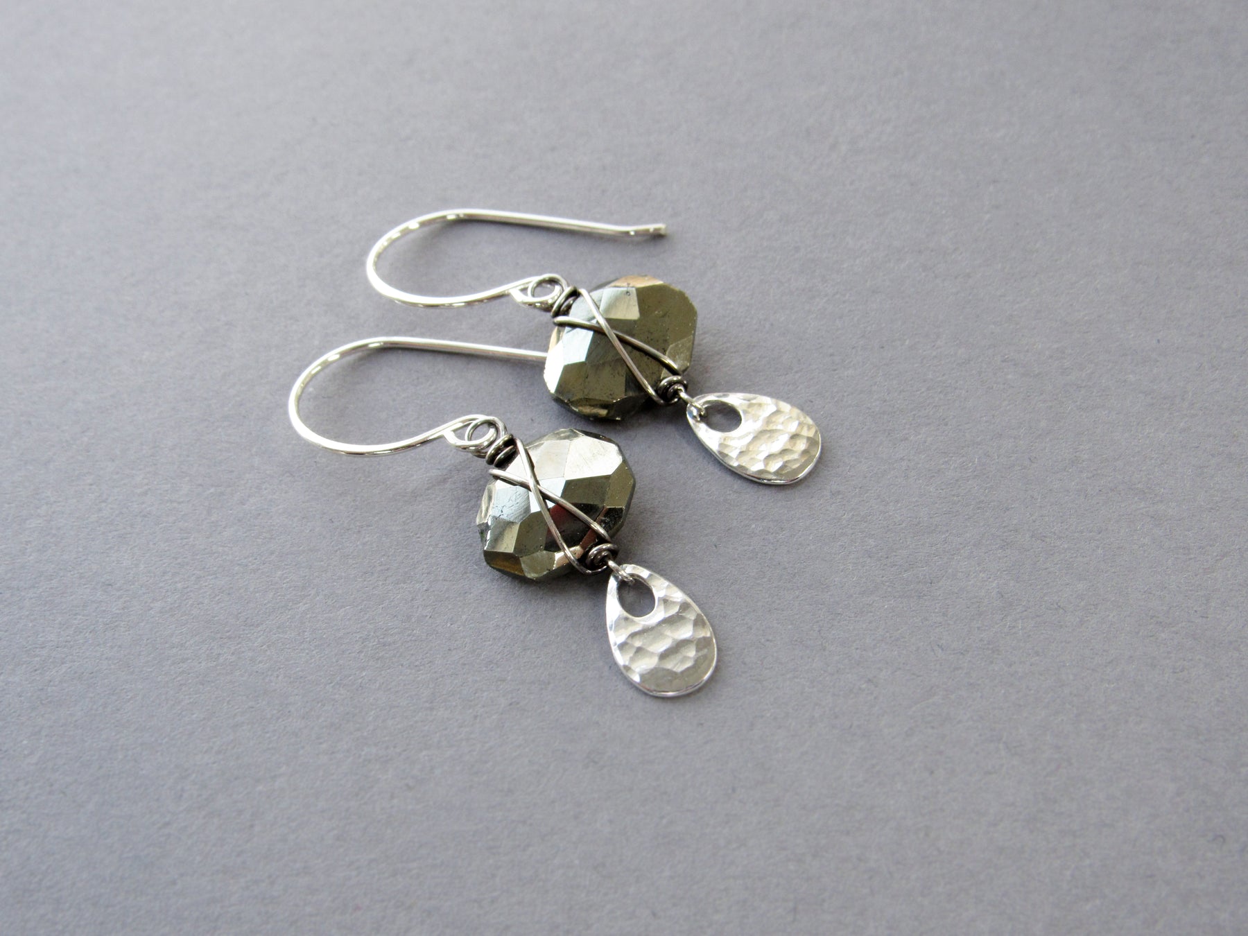 The pyrite stones are faceted for extra sparkle and they are securely wire wrapped in my signature crisscross style.  The silver charms are hand hammered for texture which gives them a lovely reflective quality.  *Please allow for slight variations in size and color of the gemstones due to their natural qualities.