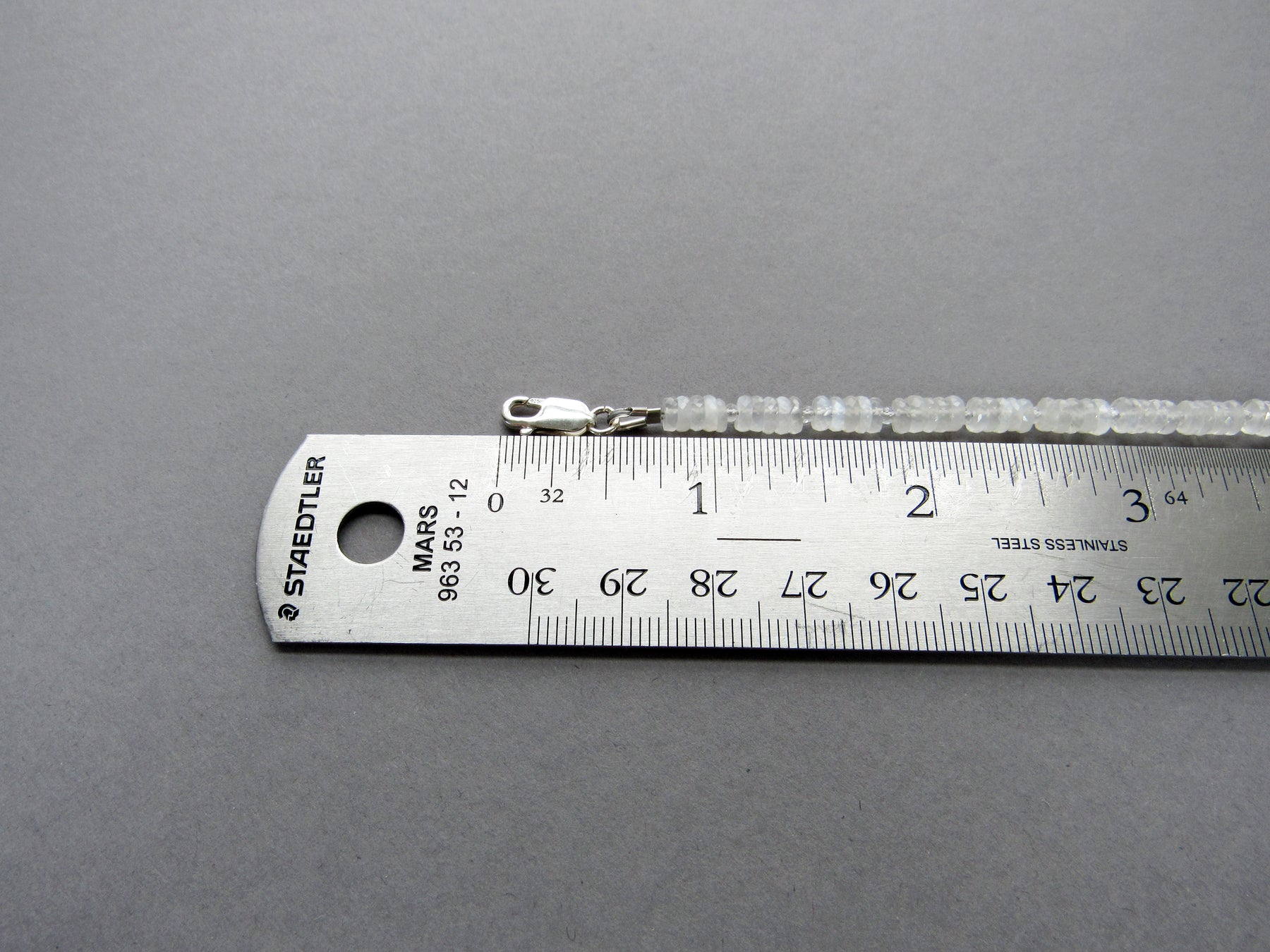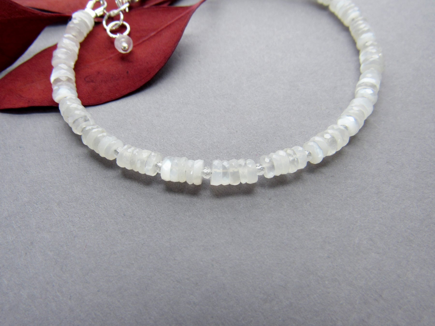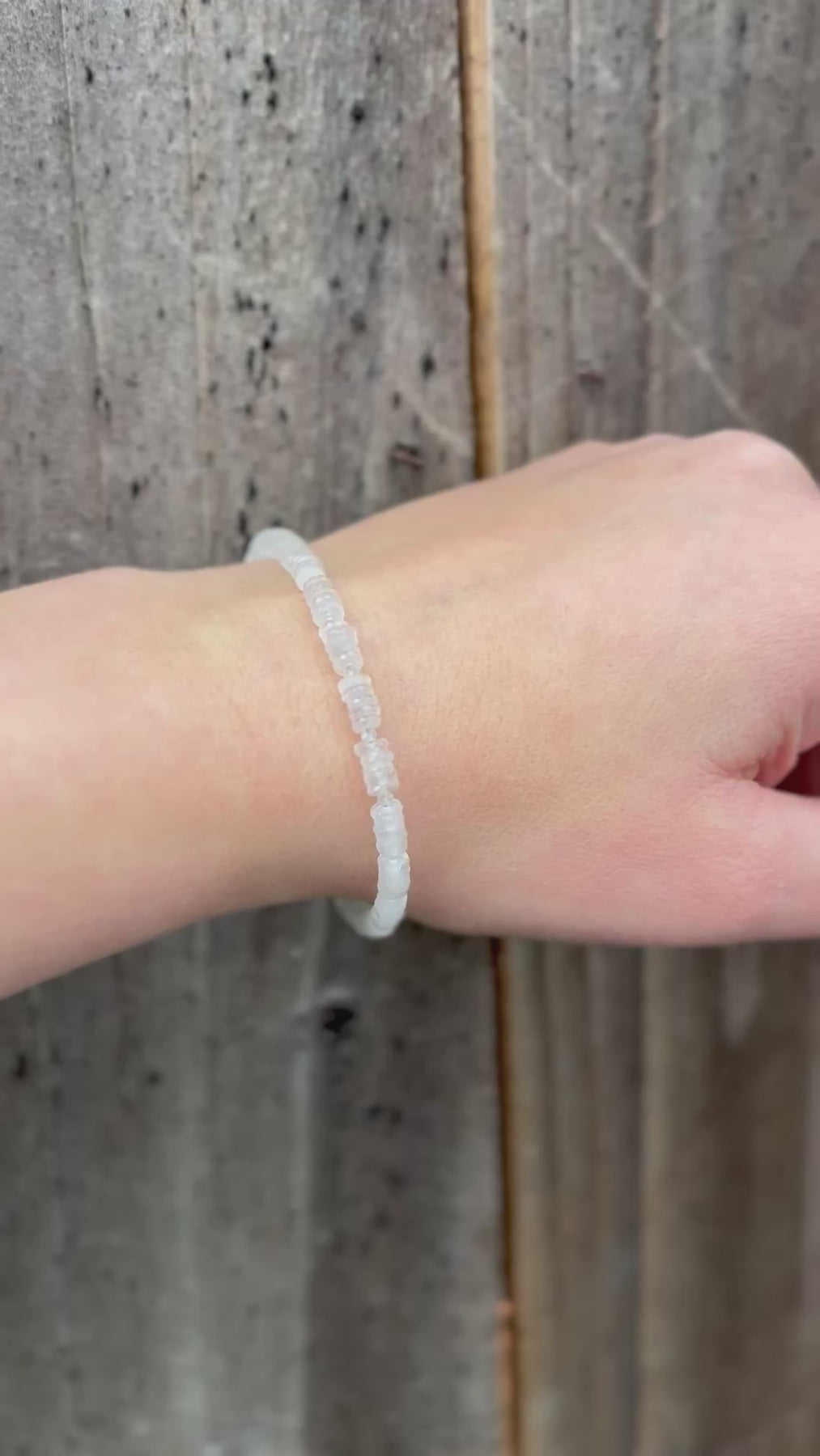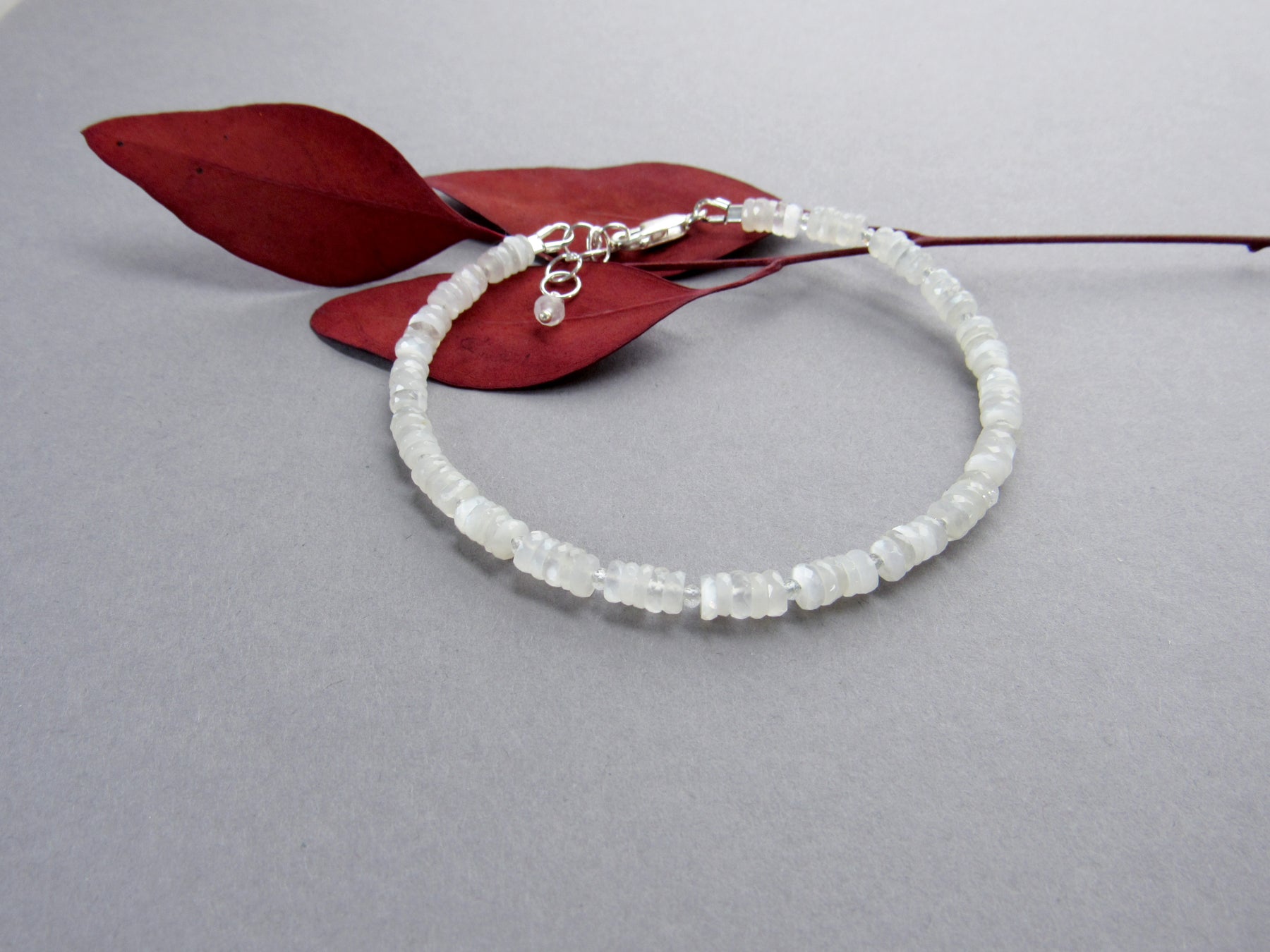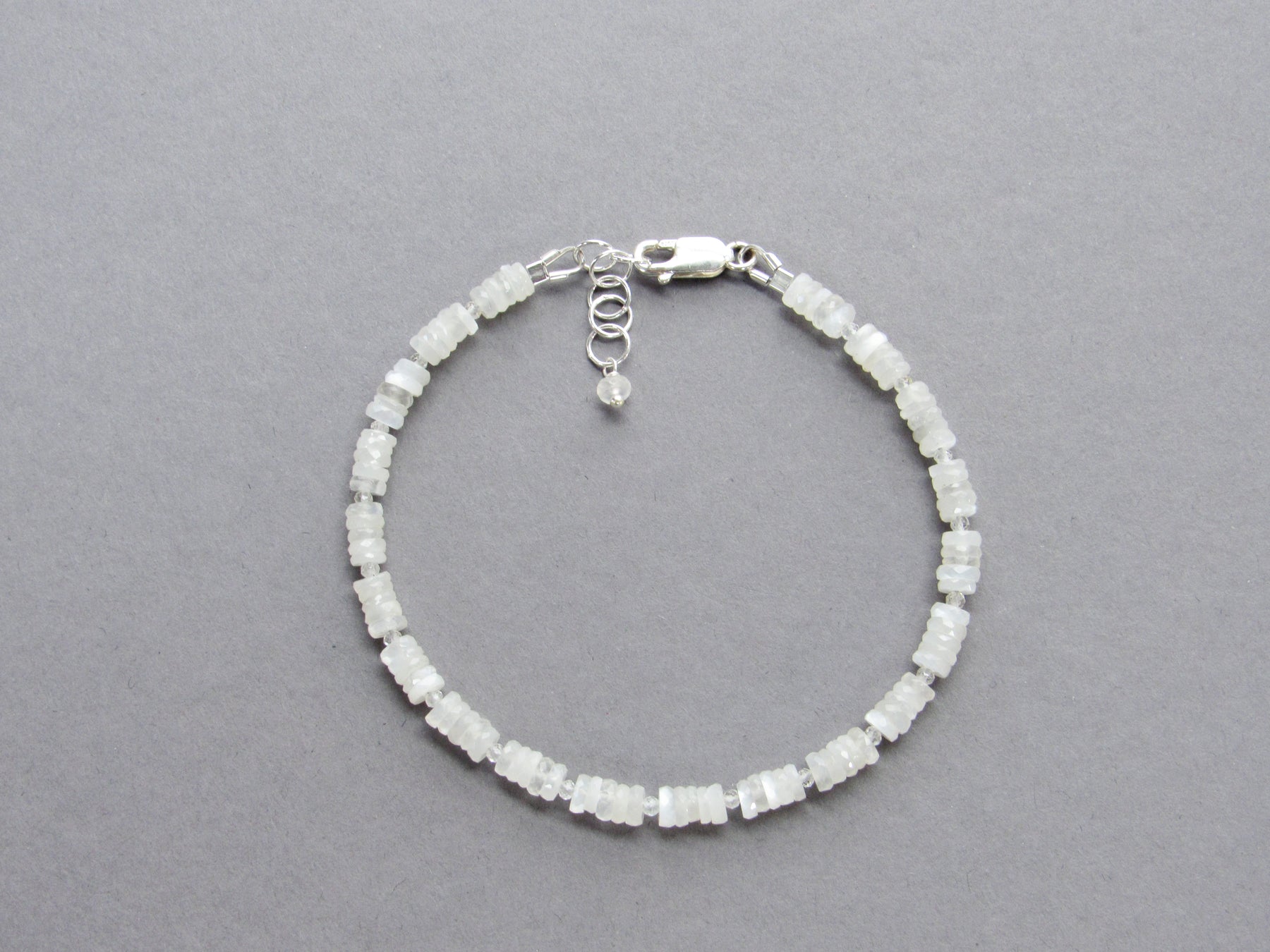 The moonstones are cut in a "wheel" shape with facets for sparkle, and I have stacked them in fives with tiny crystal quartz stones between.  This gives the bracelet nice flow and flex on the wrist.  The moonstone are a lovely soft white that shimmers and glows in the light!  They range in translucency/ opacity, please allow for slight differences as shown.