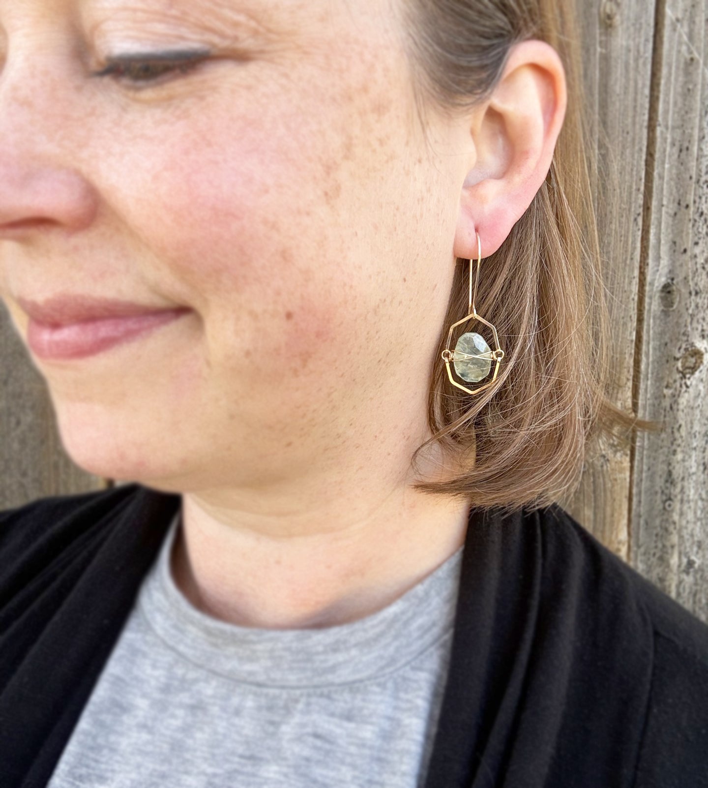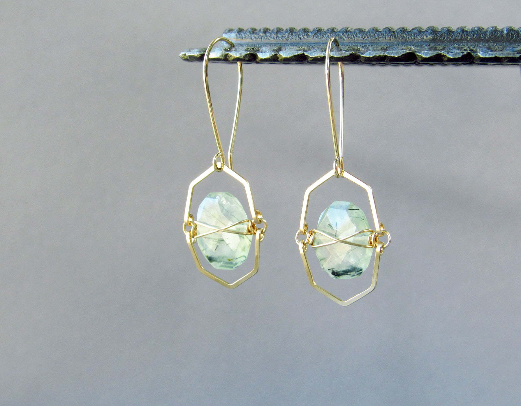 The stones are wire wrapped and suspended between hand-formed 14k gold filled frames. This gives the earrings great sparkle and movement when worn!