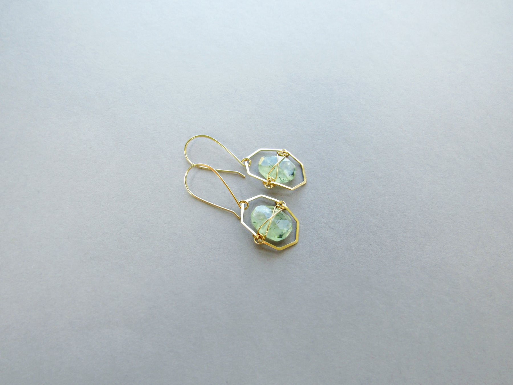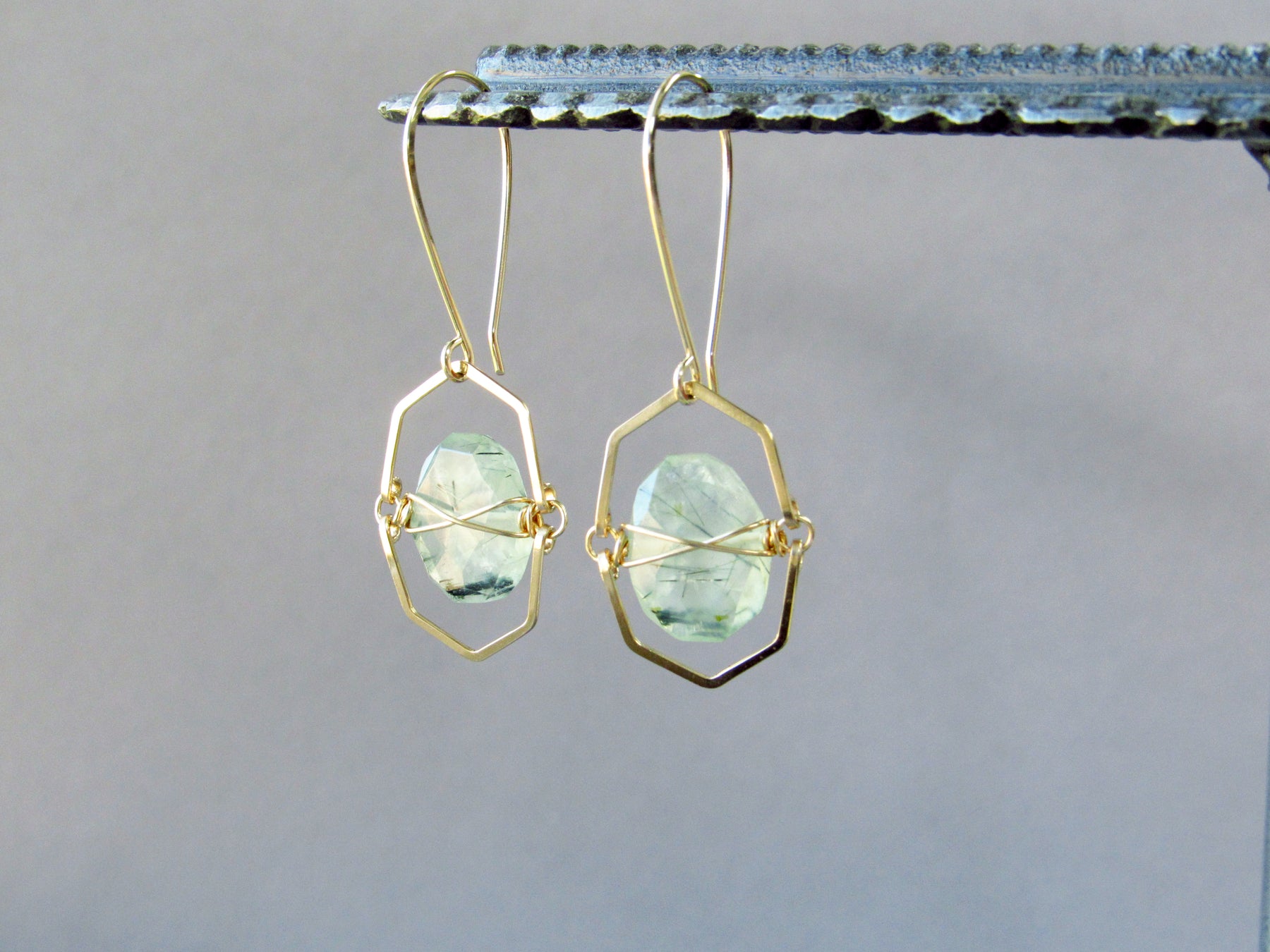 These earrings are sure to turn heads with their geometric chevron shape and luminous prehnite gems!