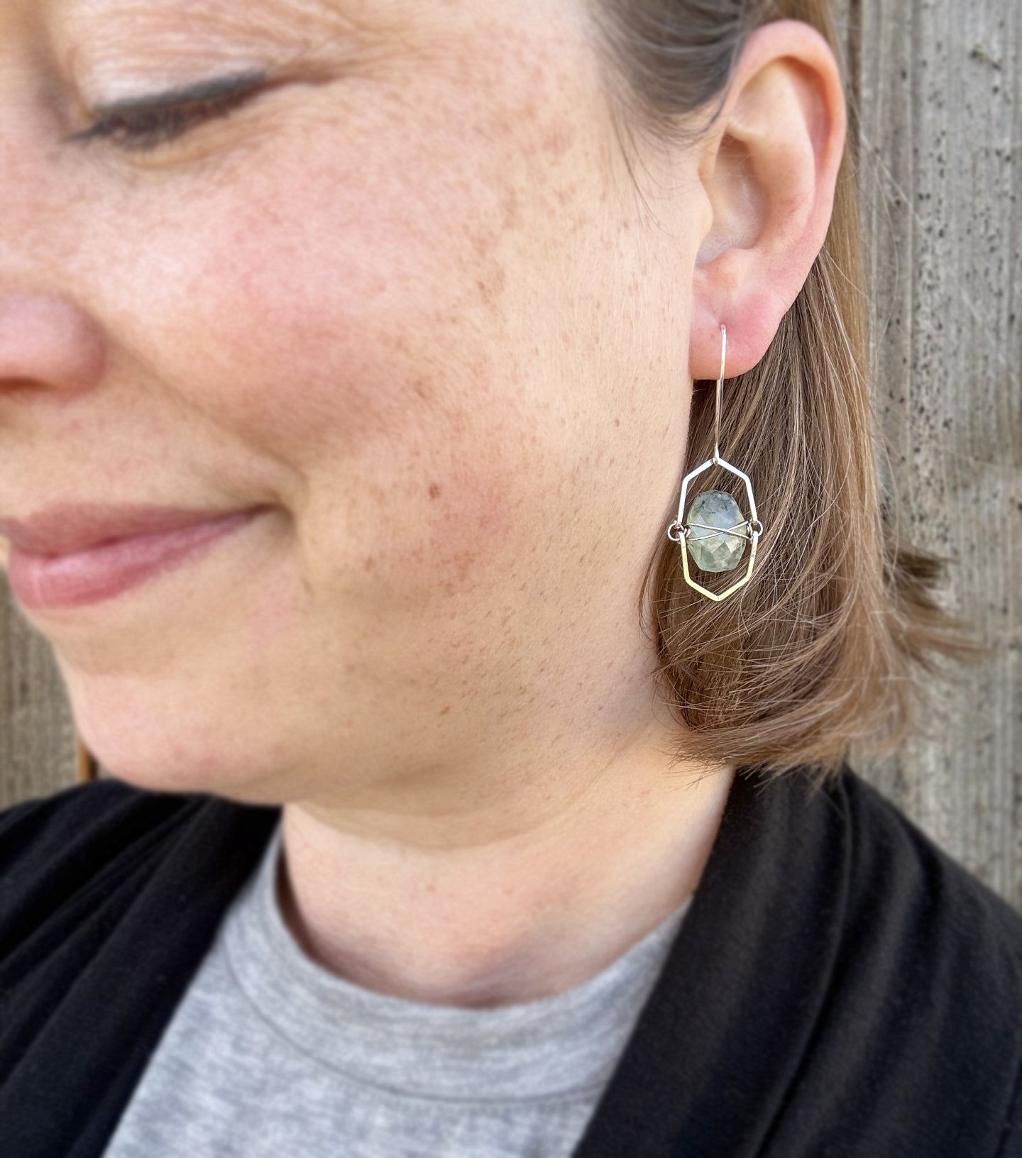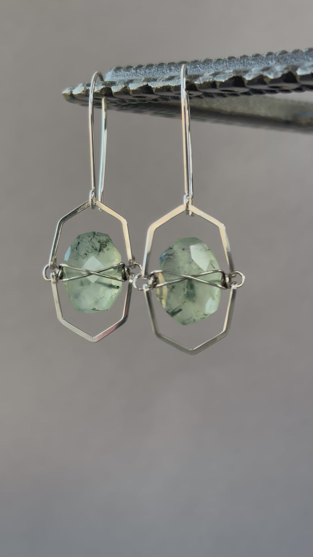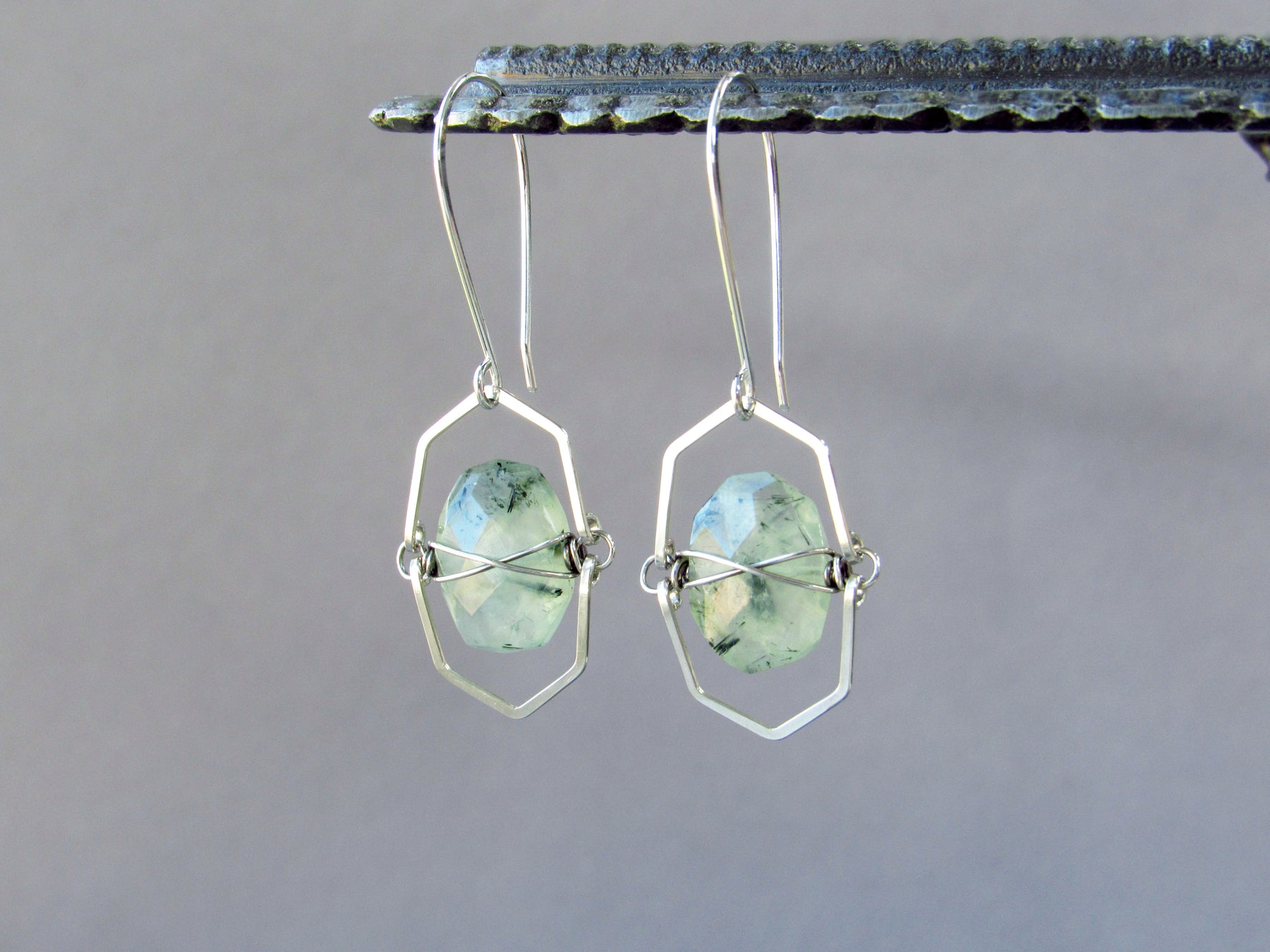 The stones are wire wrapped and suspended between hand-formed silver frames. This gives the earrings great sparkle and movement when worn!