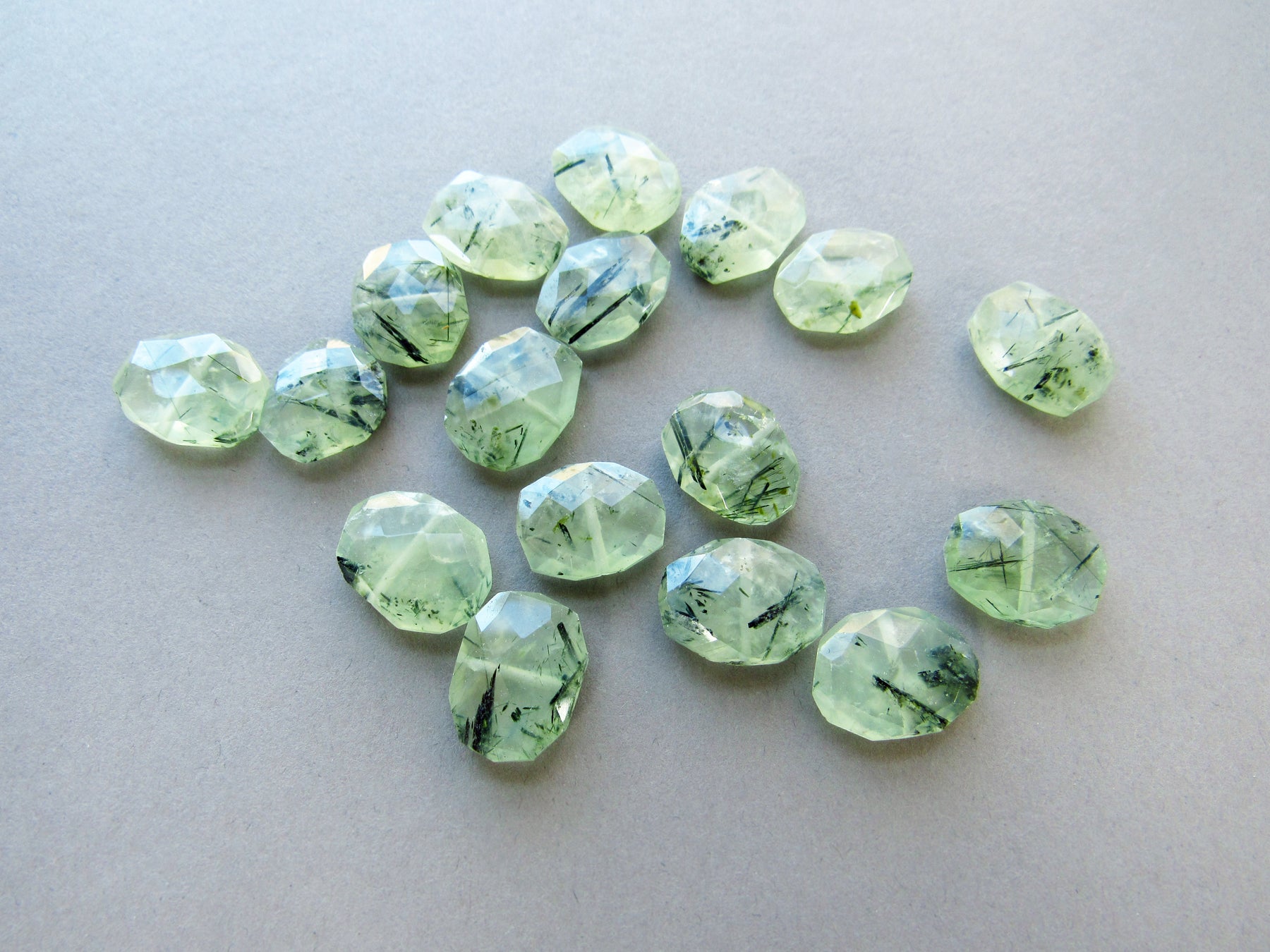 These prehnite gemstones are a beautiful soft green with needle like black/green inclusions. Each set is hand-picked to match and the amount of inclusions and color will vary a bit due to their natural qualities. Please see third photo for possible variations.