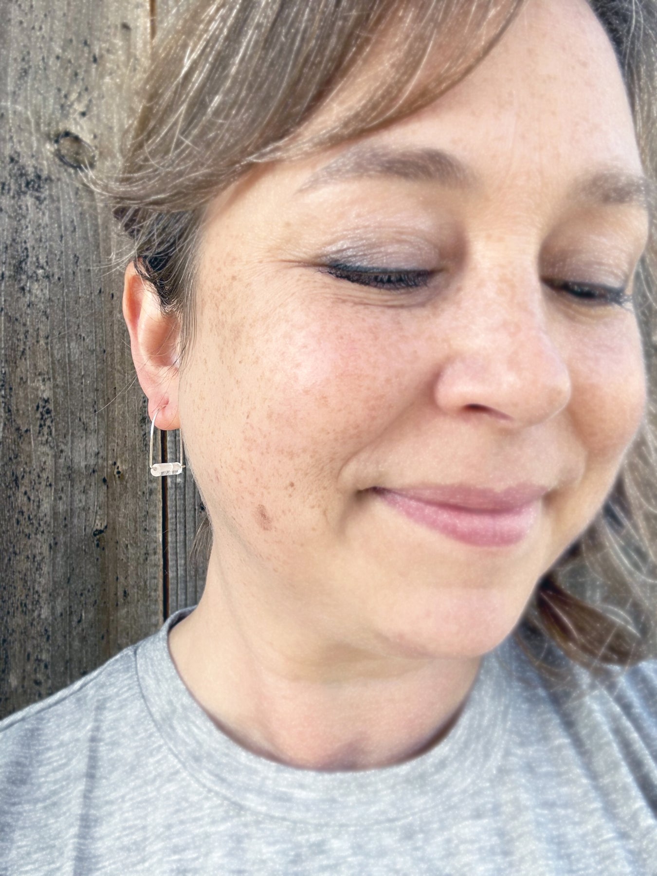 These Crystal Quartz Hoop Earrings are lightweight, casual, and secure. They will go with everything and add just the right amount of minimalist bling! Size: about 7/8" in total length.