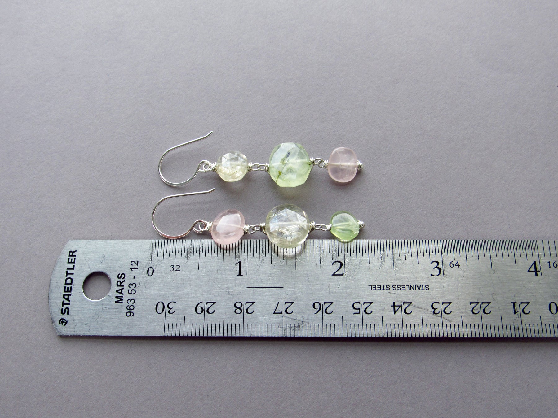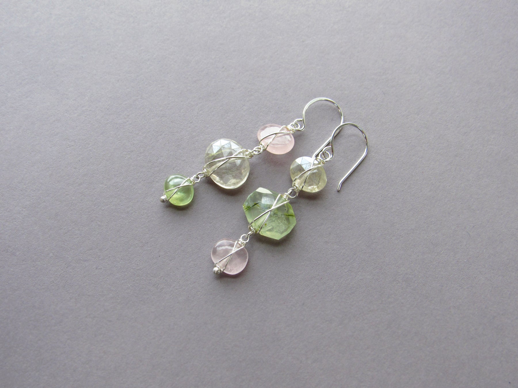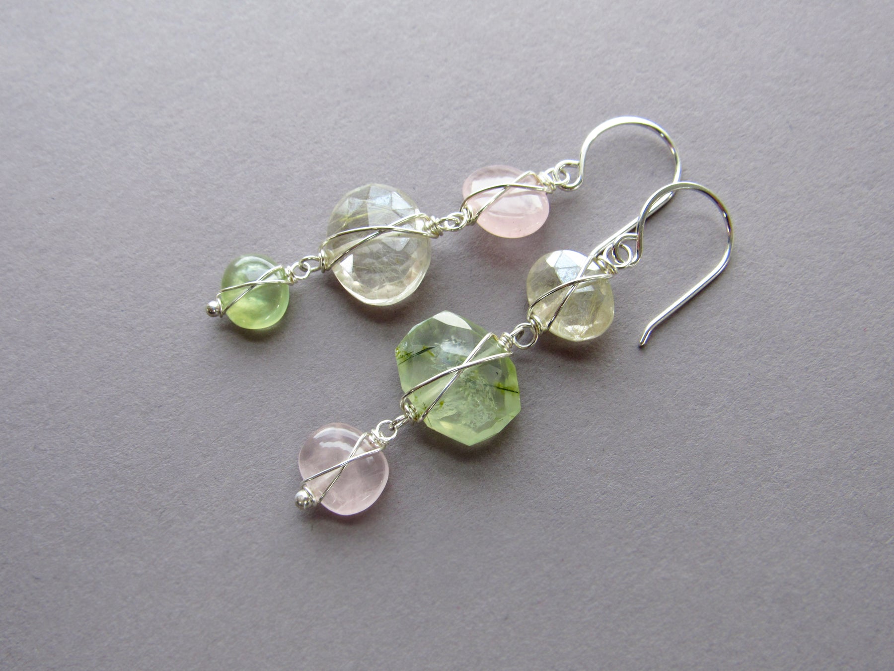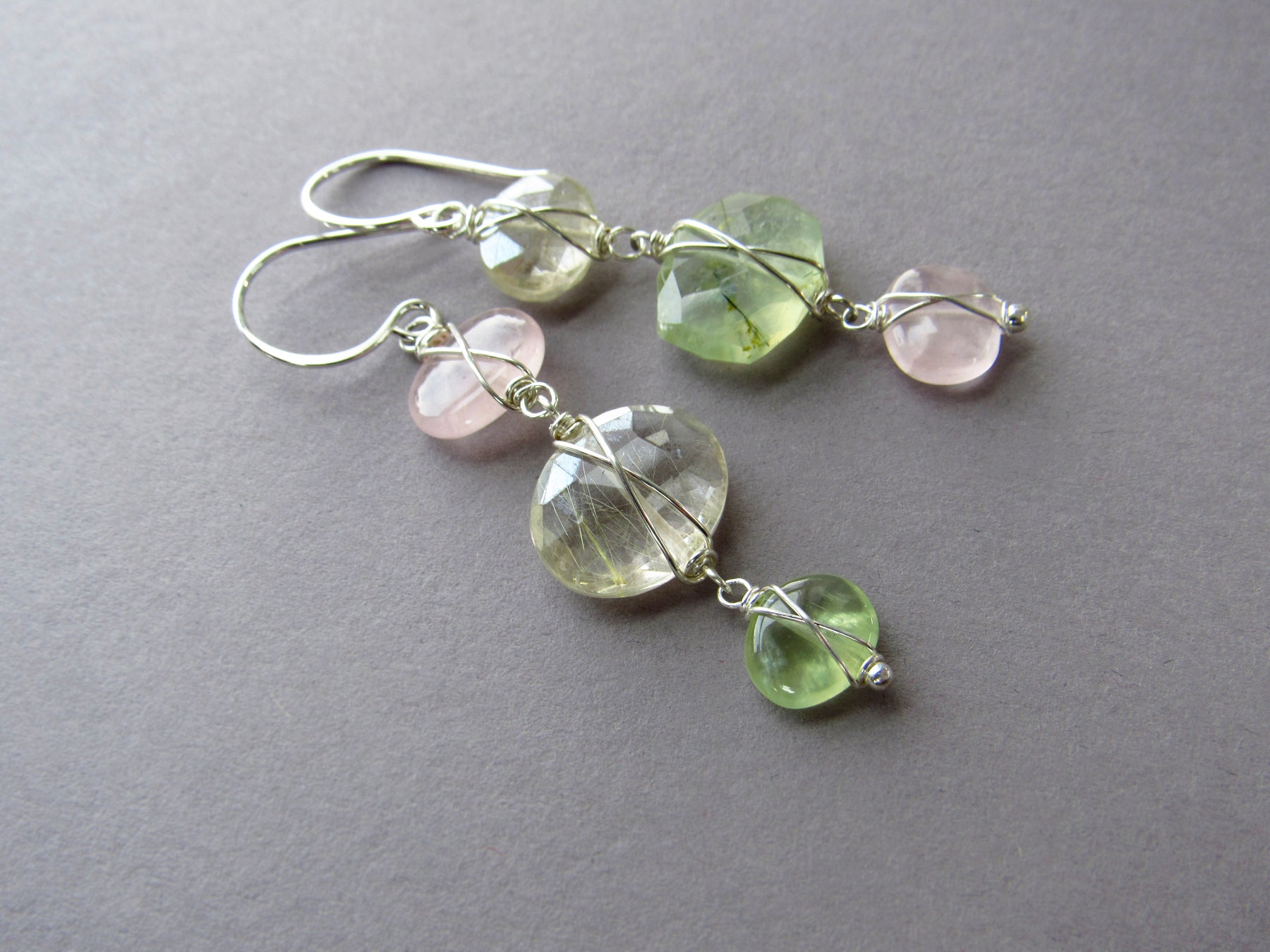 They feature a combination of three gemstones including rose quartz, gold rutile quartz, and light green prehnite. *One-of-a-kind.