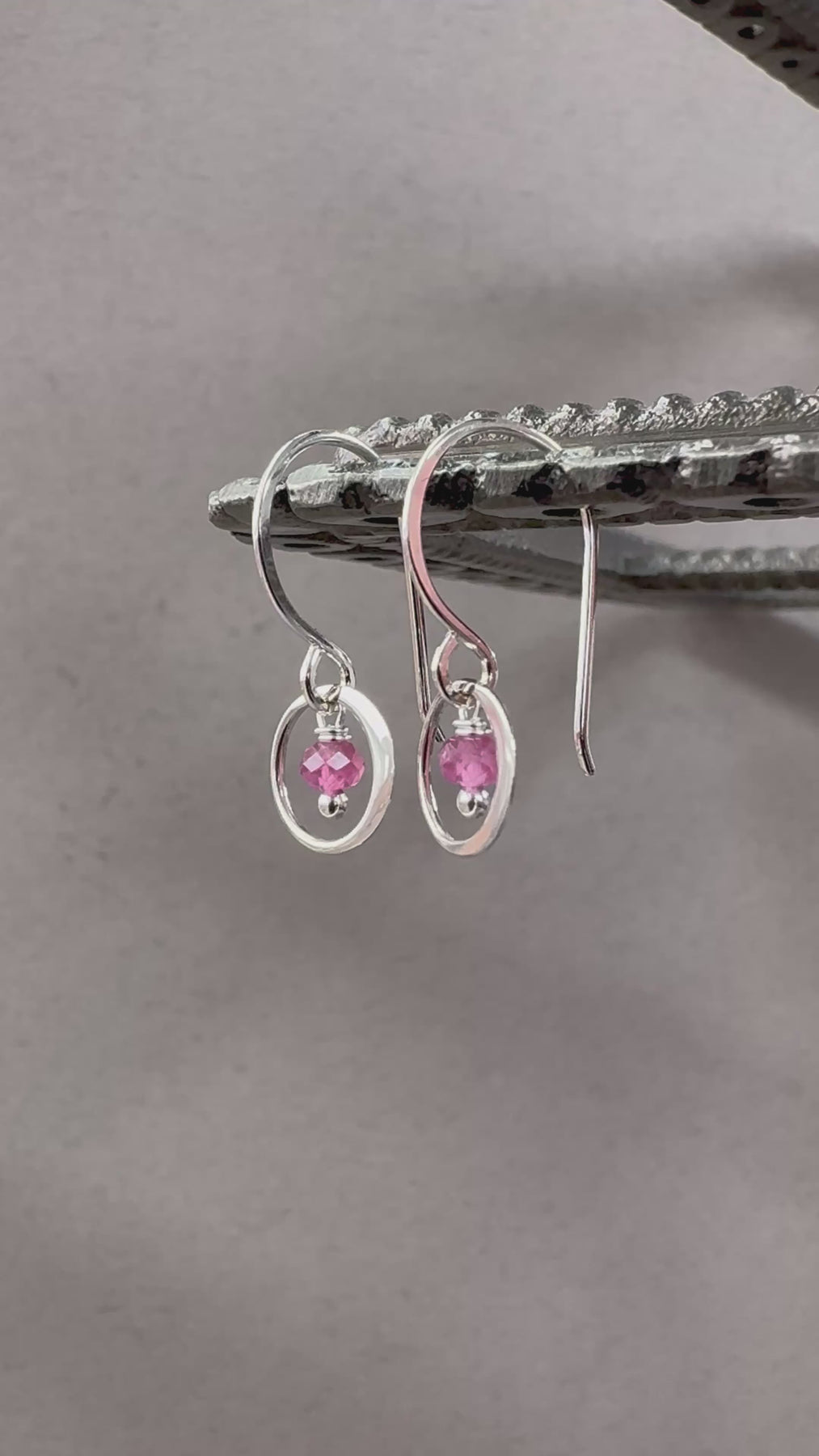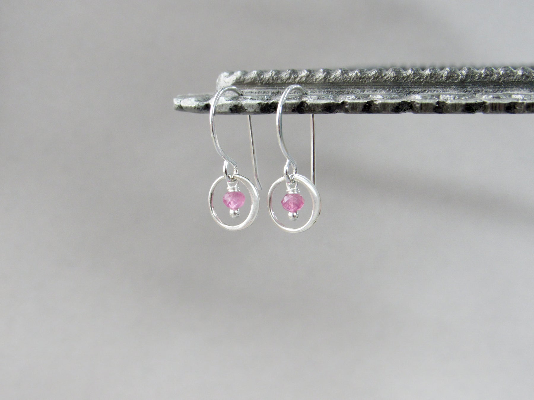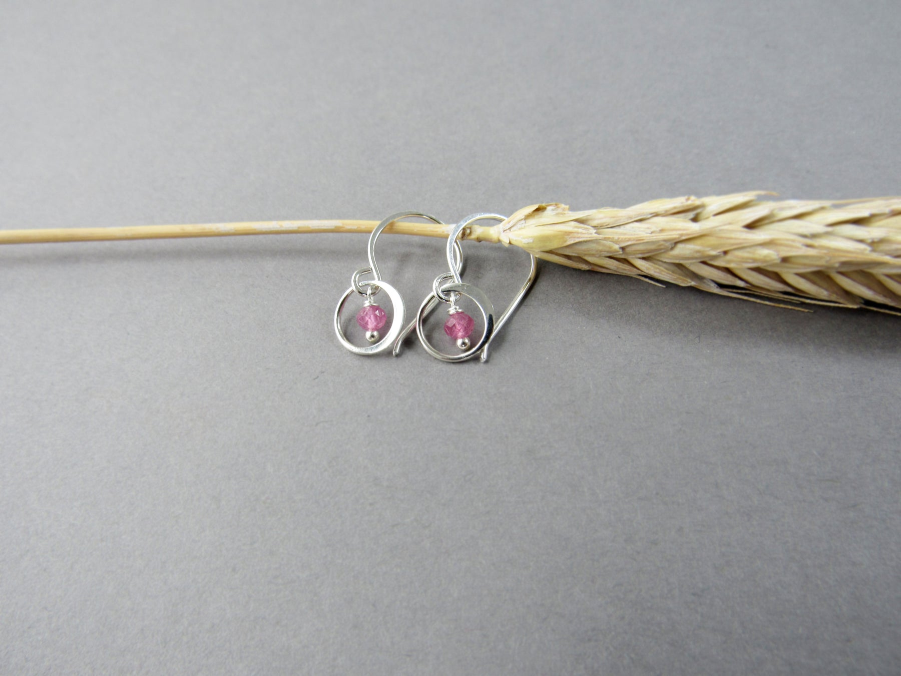 These pink tourmaline circle earrings are dainty and lightweight, and will quickly become an everyday favorite! Tourmaline is one of October's birthstones and this size is perfect for gift giving. Size: about 3/4" in total length.