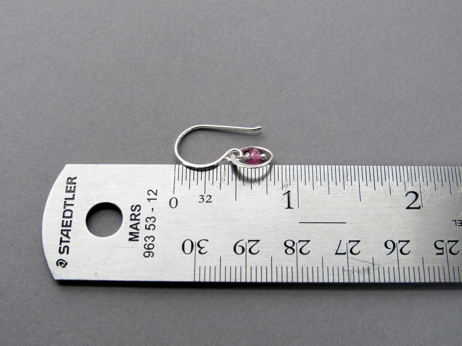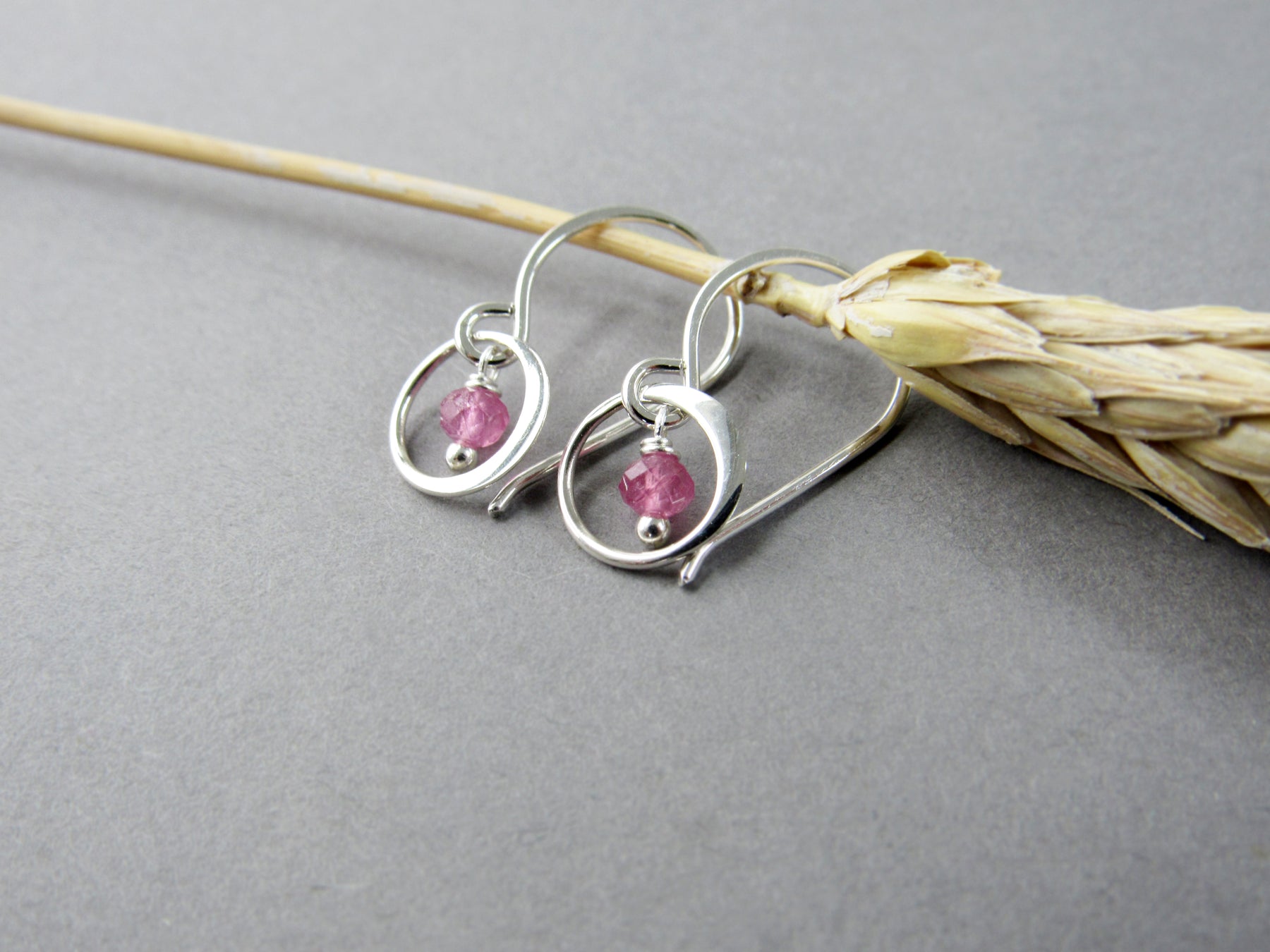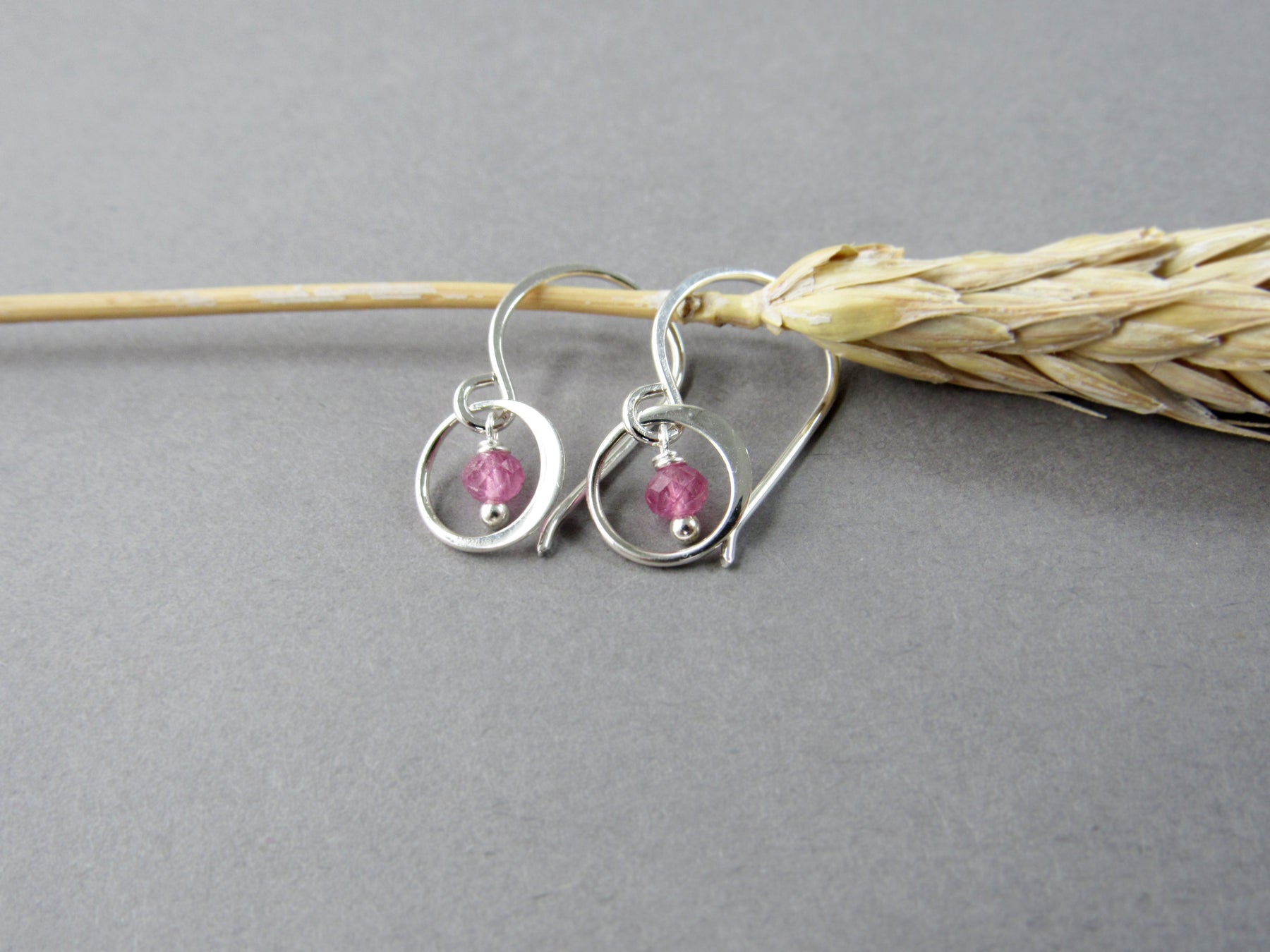 The tiny tourmaline stones are all natural and have a lovely pink color. They are slightly translucent and are faceted for a bit of sparkle. *Due to their natural qualities, please allow for slight variations in color and size of the gemstones. The stones are securely wire wrapped in silver wire and are suspended in hammered silver circles. All of our ear wires are made from scratch in our studio using 20 gauge wire. They are formed, lightly hammered for strength, and polished for shine!